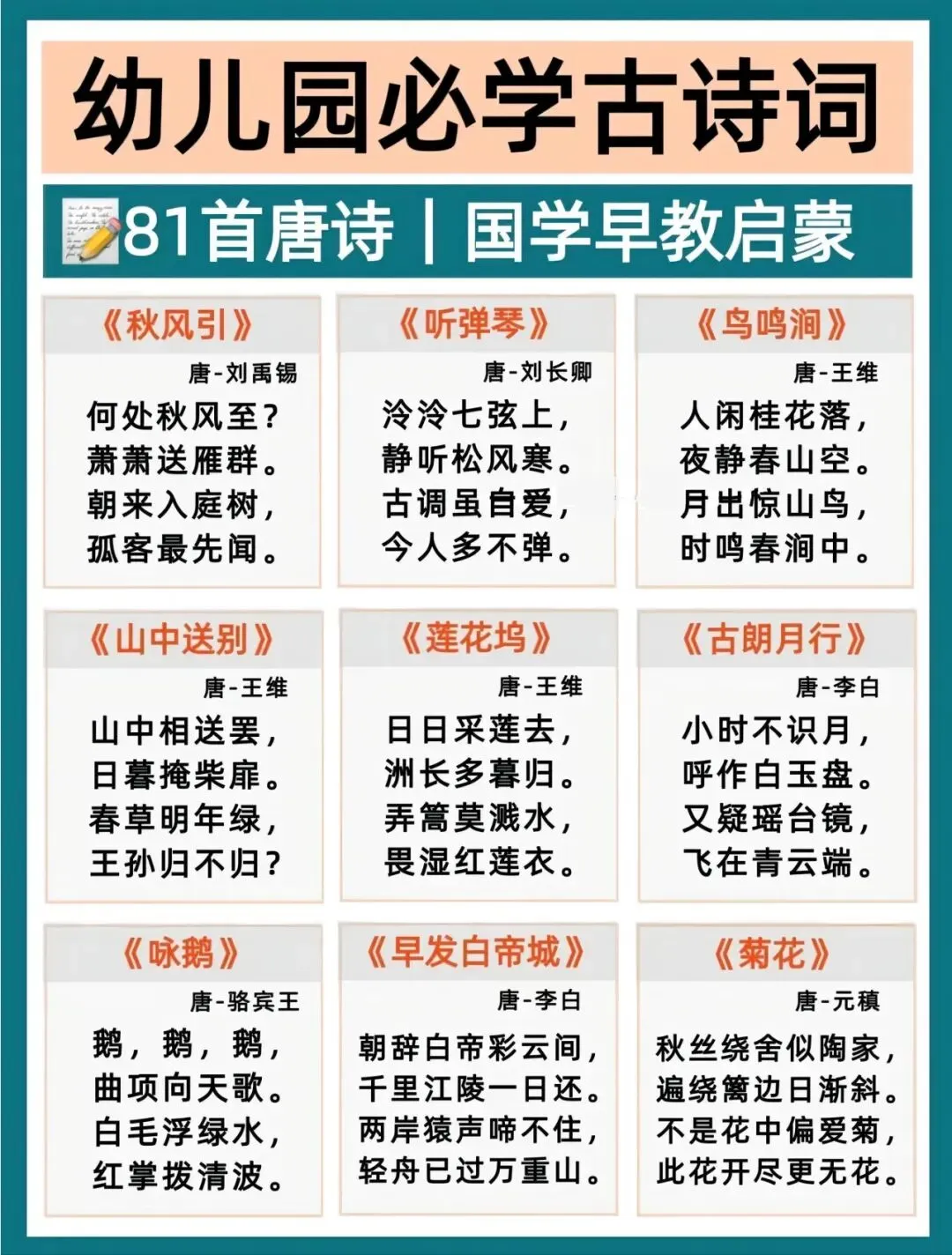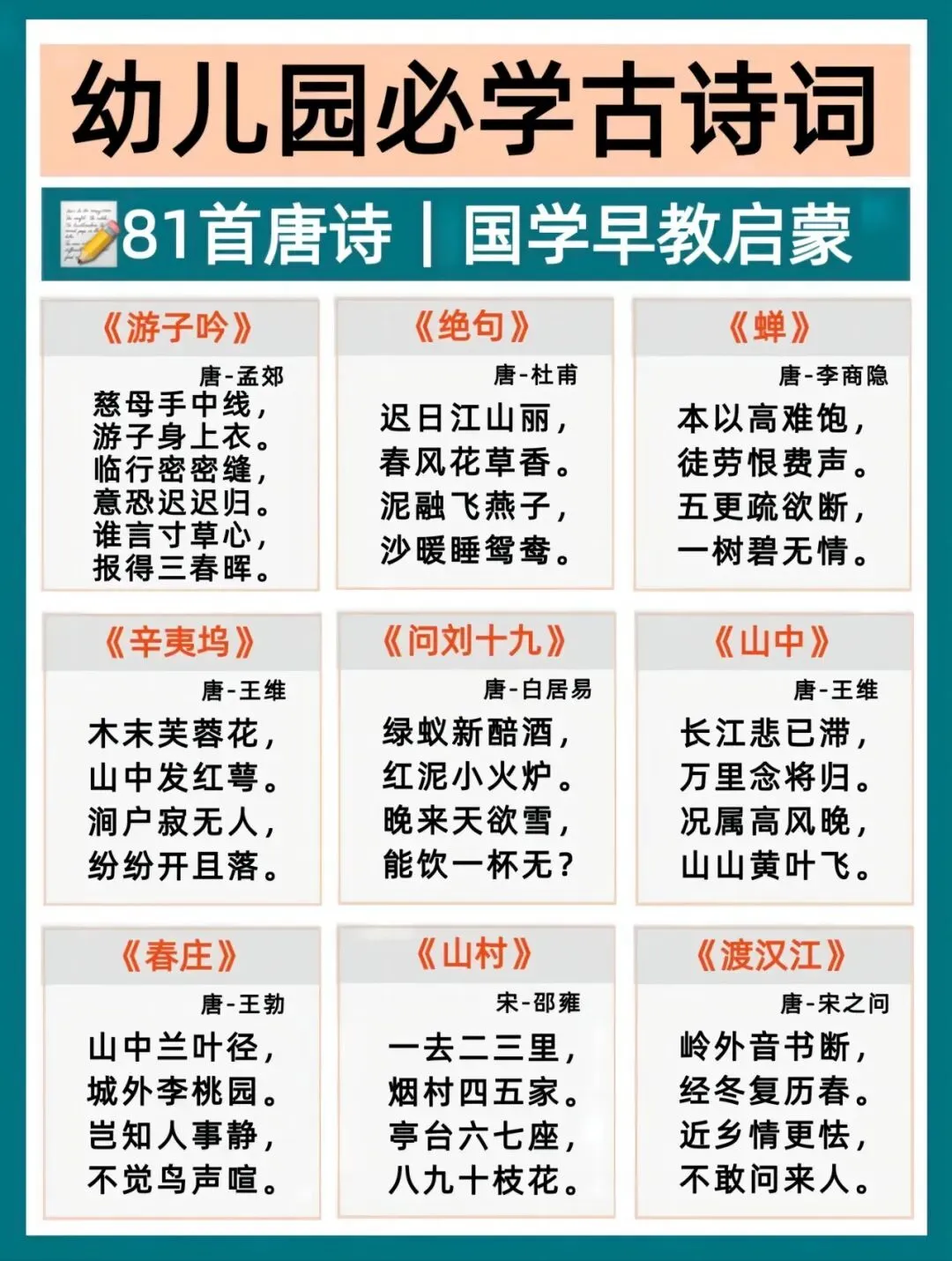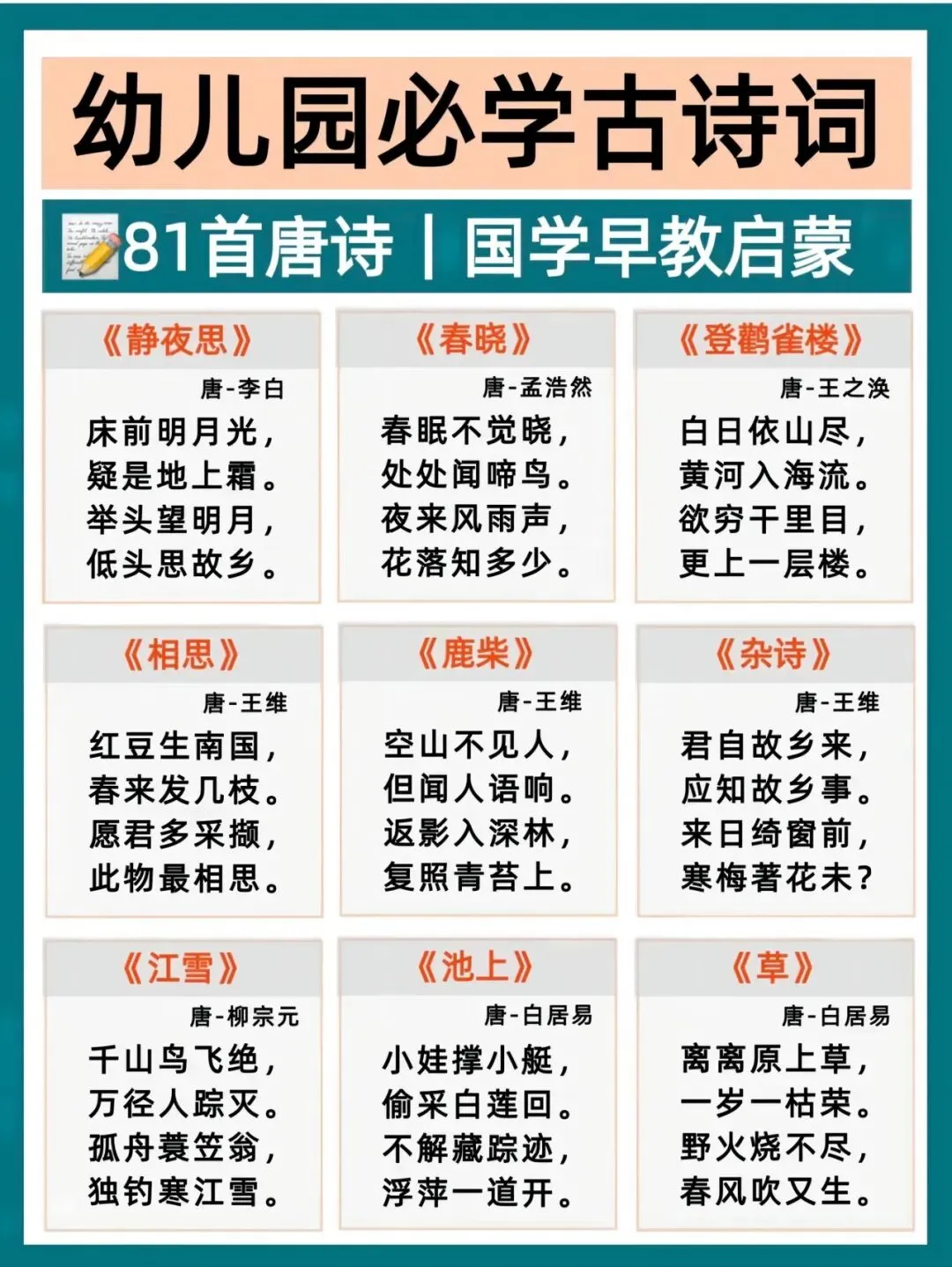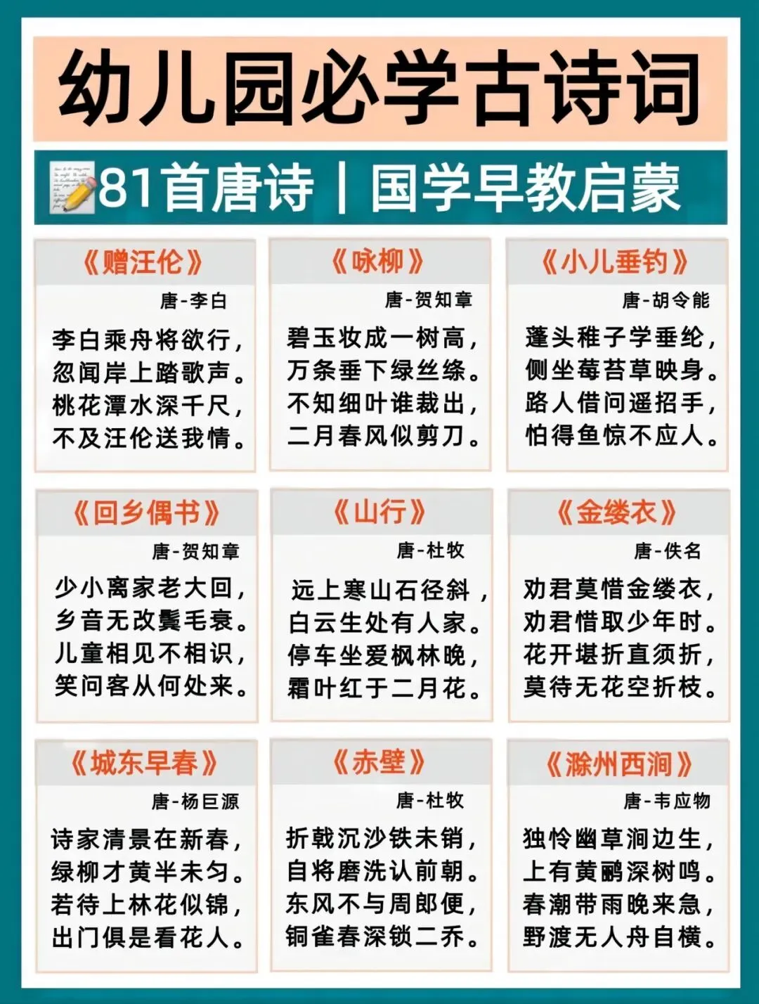 幼小衔接语文打底,古诗积累越早越轻松!每天一首,培养语感、打好识字基础,为一年级语文轻松铺路。这份必背古诗清单,家长直接带娃练起来~