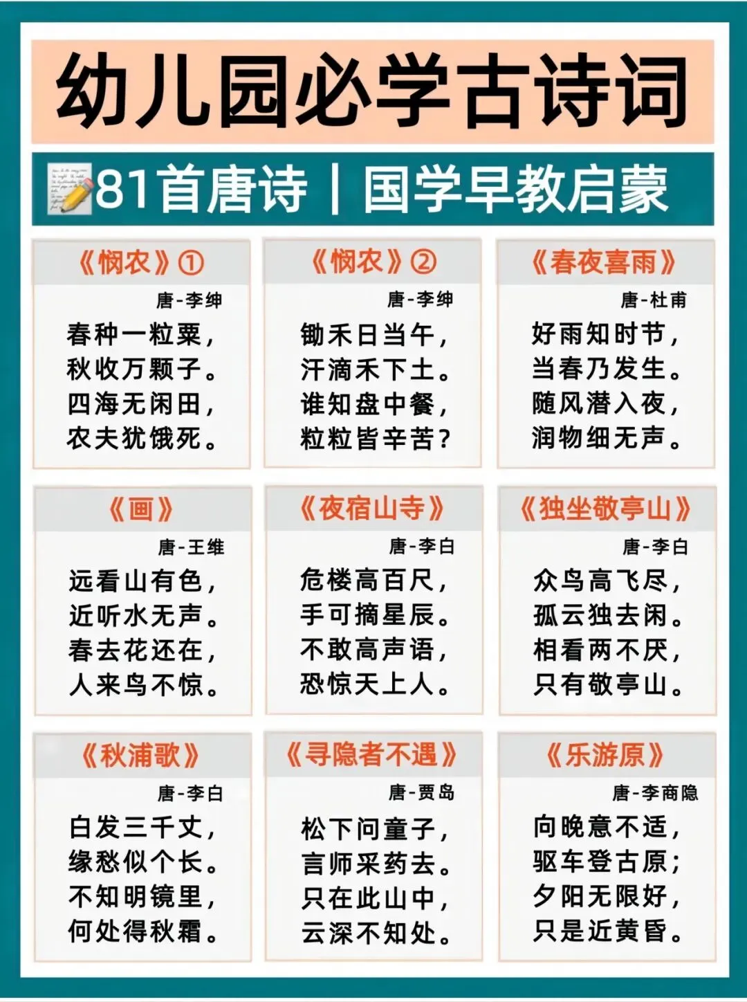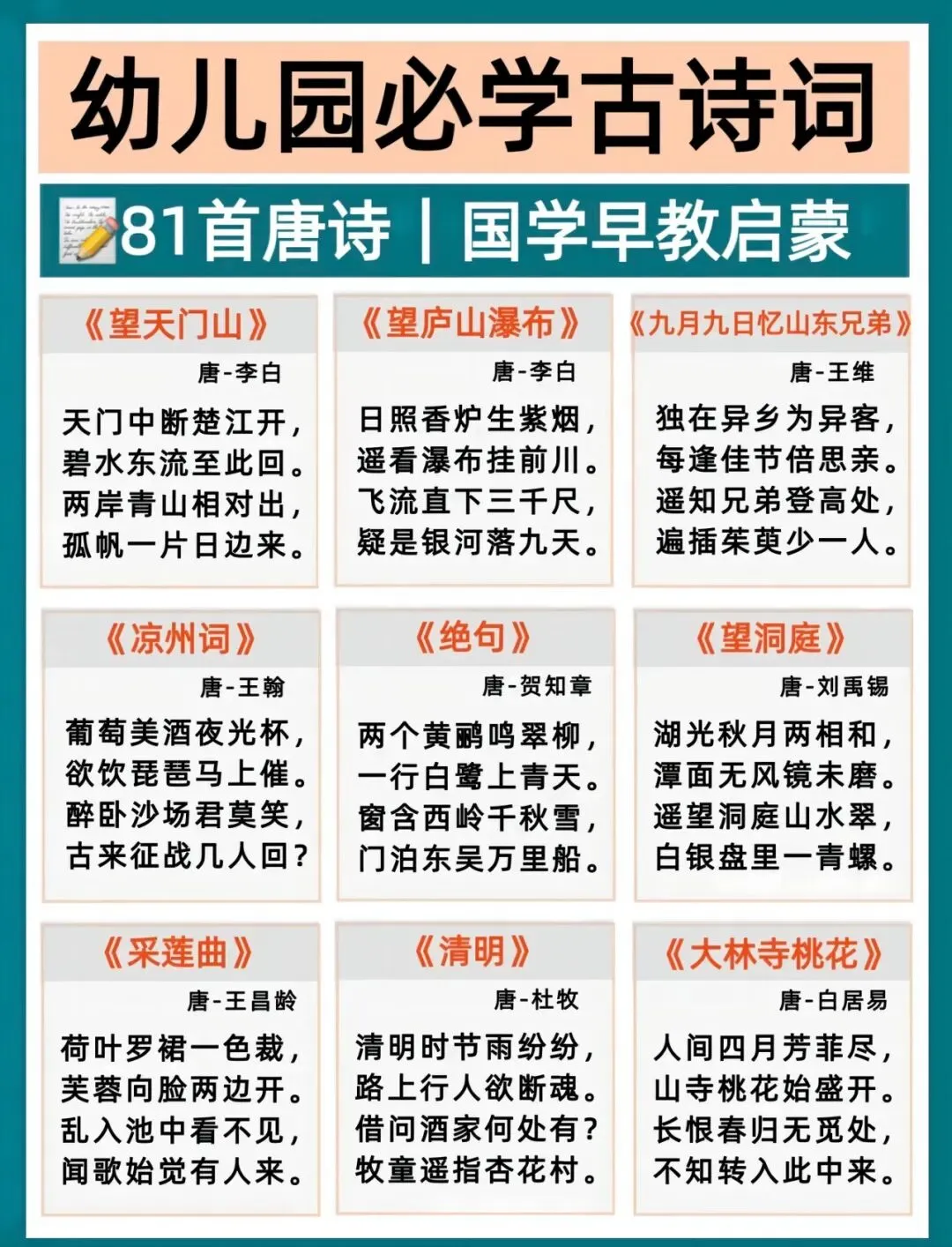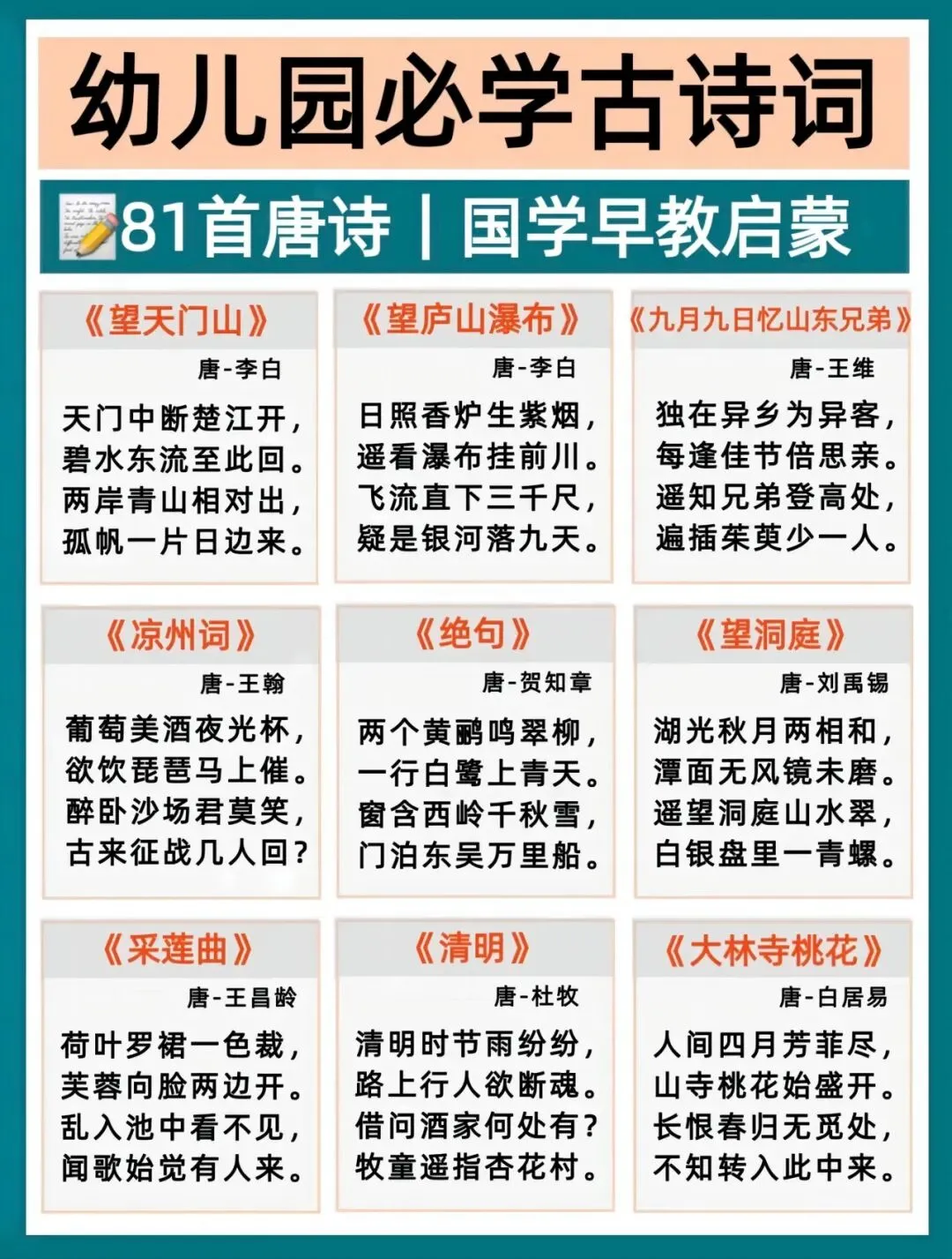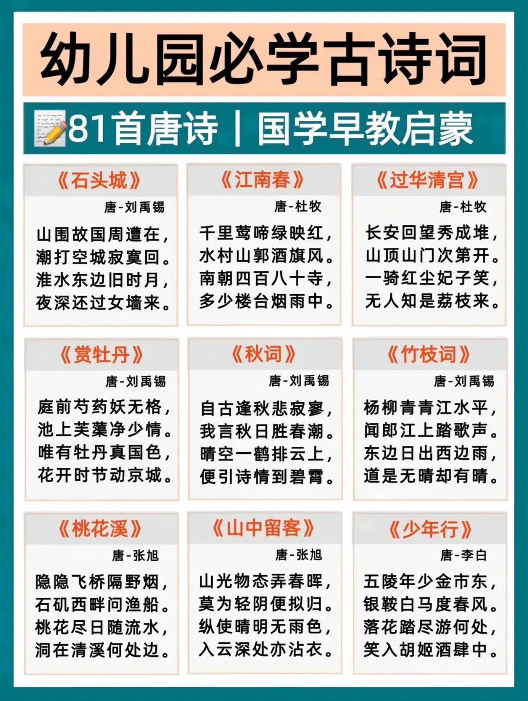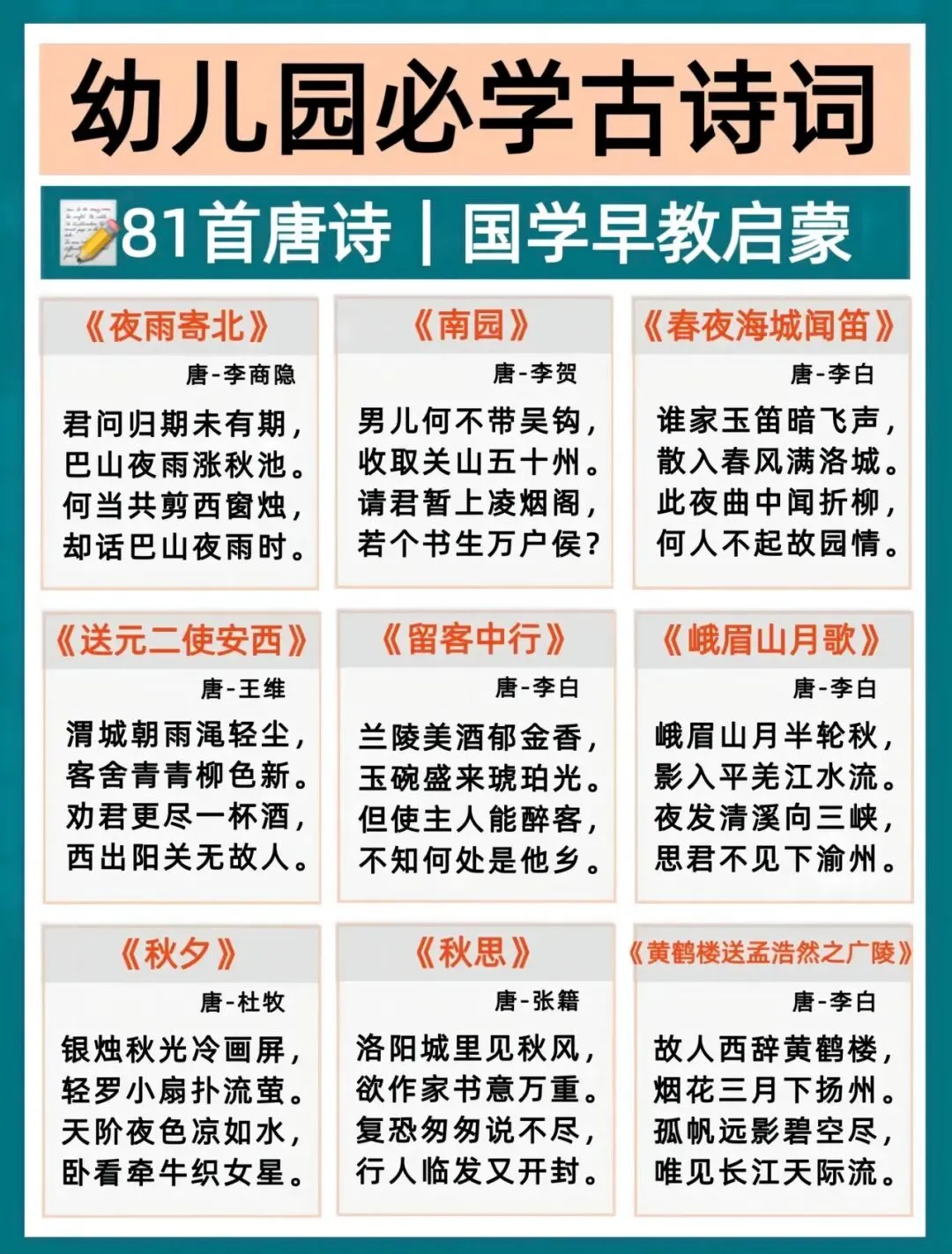 幼小衔接语文打底,古诗积累越早越轻松!每天一首,培养语感、打好识字基础,为一年级语文轻松铺路。这份必背古诗清单,家长直接带娃练起来~