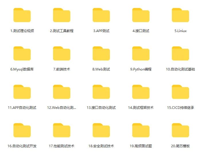 为此,我特意与几位大厂后端技术专家,一起整理出了一套非常实用的【软件测试面试宝典合集】,包含测试基础、功能测试、linux、mysql、接口测试、jmeter、测试工具、web自动化测试、selenium、python编程、app自动化测试、性能测试、安全测试、测试开发、简历模板等等…..帮助大家找准技术方向!