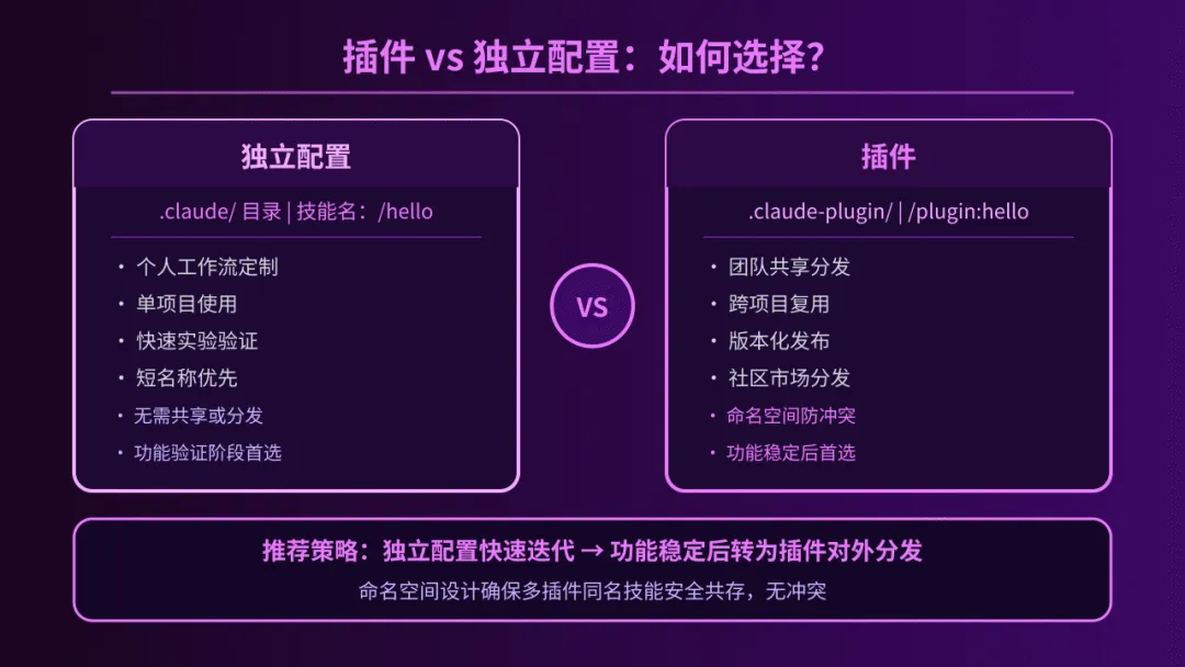 .claude/ 目录下,适合快速迭代的个人工作流或单项目定制,其技能名称简洁(如 /hello)。而插件则拥有独立的目录结构和 plugin.json 清单文件,其核心优势在于引入了命名空间设计(如 /my-plugin:hello),有效避免了多插件并存时的名称冲突。建议策略是:先通过独立配置快速实验验证,待功能稳定后再转为插件进行分发和跨项目复用。3. 五步创建第一个插件