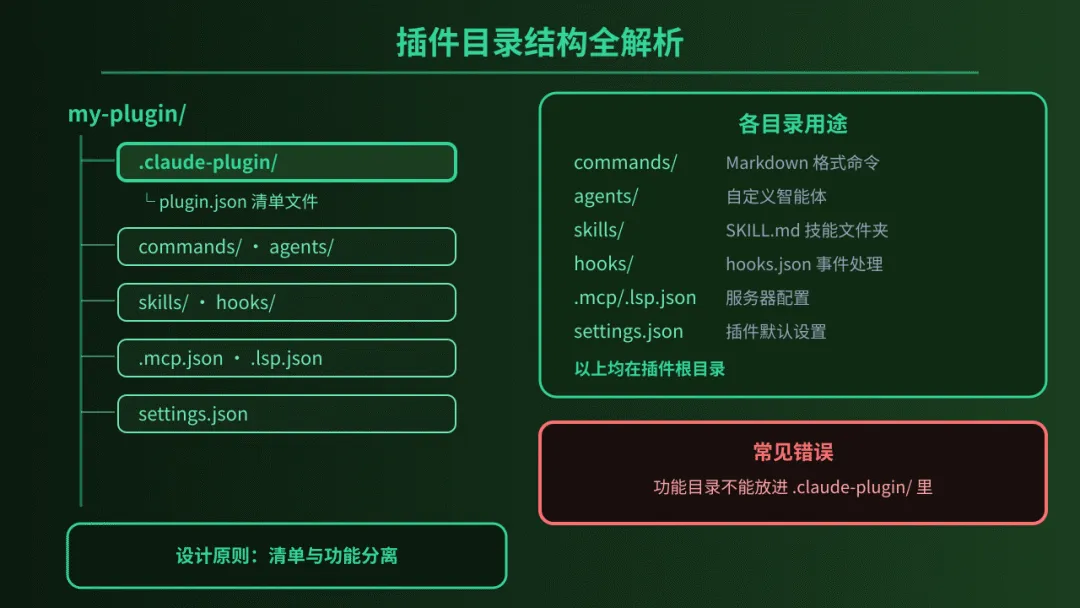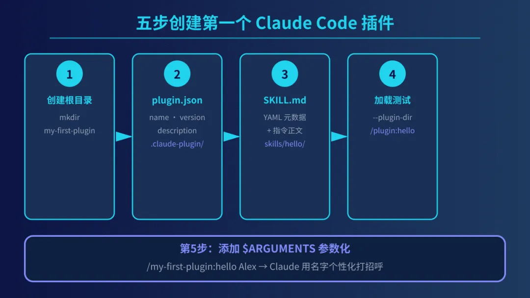 .claude-plugin/ 目录下编写 plugin.json 清单,定义插件元数据;第三步,在 skills/ 目录下创建子文件夹并编写 SKILL.md,这是技能指令的归宿;第四步,利用 --plugin-dir 参数启动 Claude Code 进行加载测试;最后,通过 $ARGUMENTS 占位符实现参数化输入(如 /plugin:hello Alex)。这套流程清晰、高效,是所有高级扩展的基础。4. 插件目录结构全解析