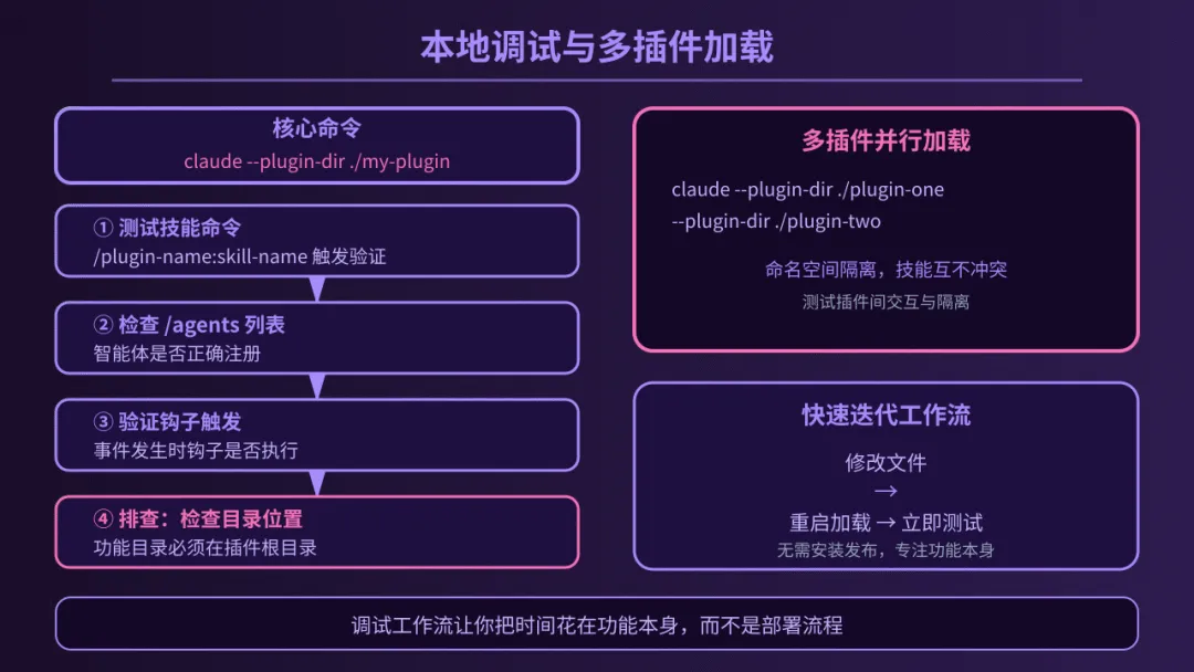 .lsp.json 为特定语言提供类型检查和定义跳转等深度智能体验;settings.json 则定义了插件启用时的默认配置,甚至可以指定主线程智能体(Agent),从根本上改变助手的行为模式。6. 本地调试与多插件加载