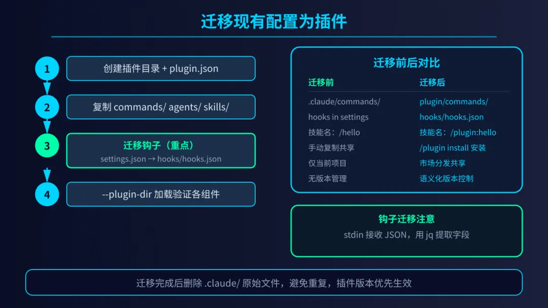 .claude/ 配置升级为插件仅需四个步骤:准备插件目录与清单、平移功能文件、重构钩子(将 hooks 配置移入独立的 hooks/hooks.json)以及重新加载验证。虽然迁移后技能名会带上前缀,但你换取的是更好的版本管理能力和更便捷的团队共享方式。一旦迁移完成,即可清理项目内的零散配置,实现规范化管理。8. 迈向 Claude Code 插件生态