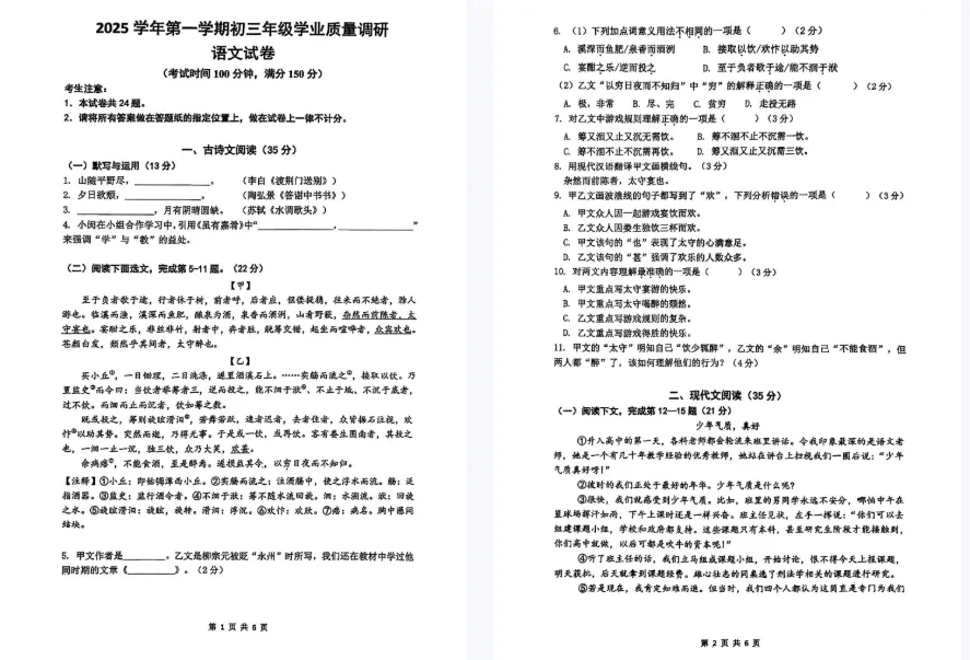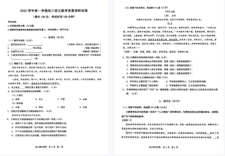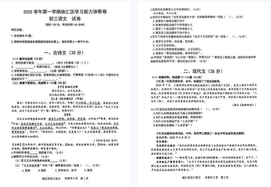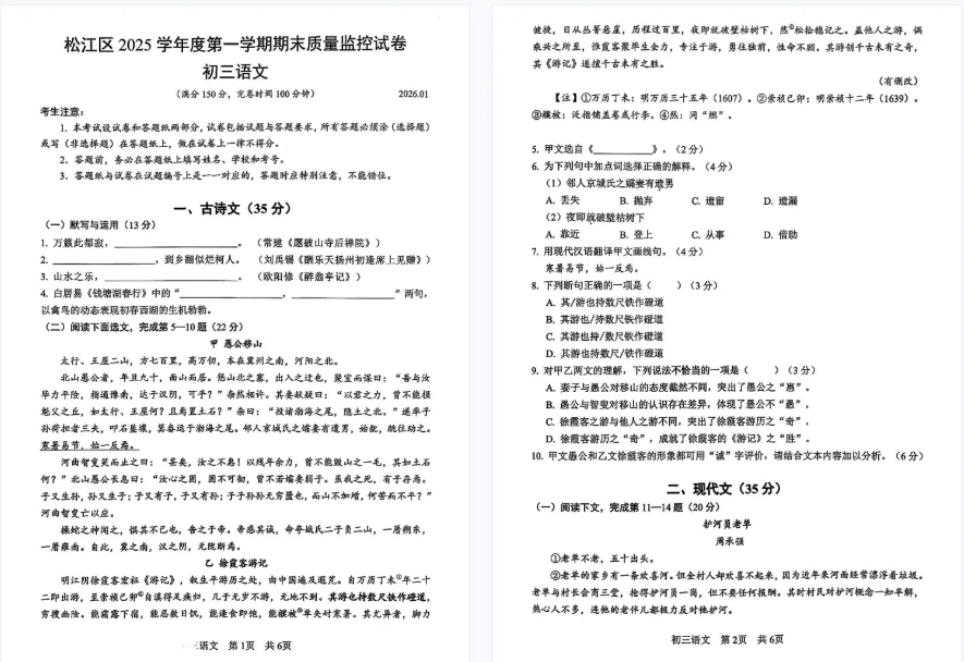 【PDF可下载】2026上海16区初三一模语文试卷+答案分享!