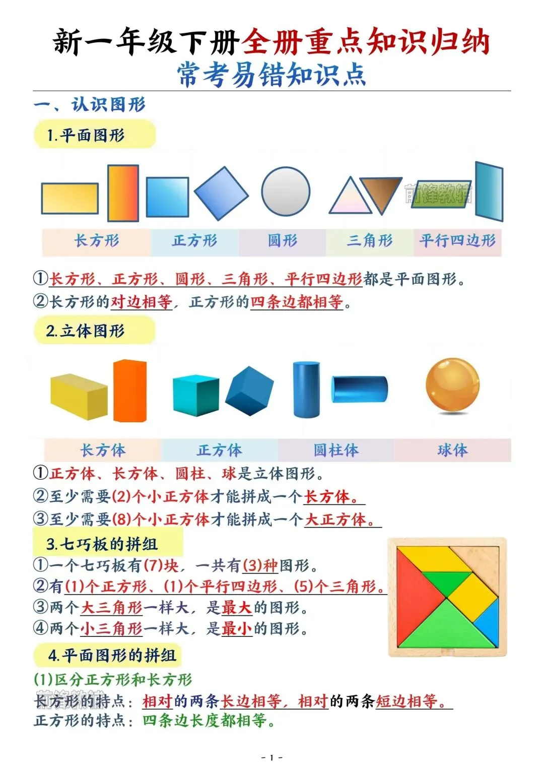 老师刚整理的!!新一年级下册数学全册重点知识归纳(共7页)!家长看文末领取方式,给孩子领回去打印出来练习吧!