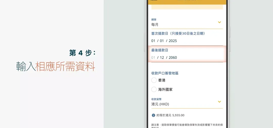 也可以选择定期提领,设置年限范围、提领方式(固定/每期递增3%)、金额、付款方式。