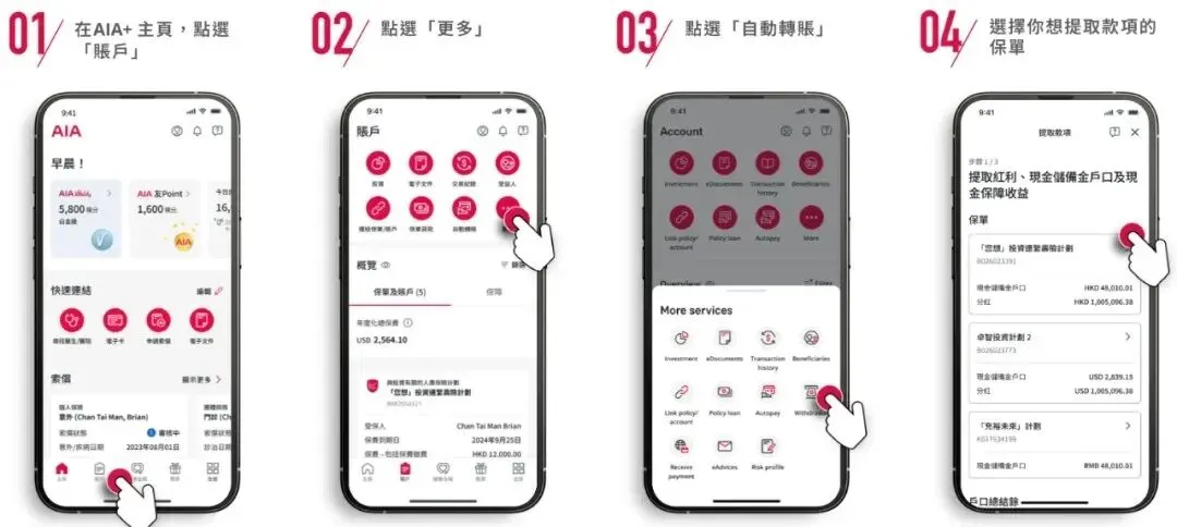 友邦APP提领步骤:进入主页→账户→更多→自动转账。
