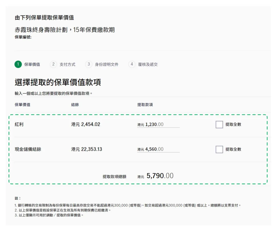 选择对应保单及提取类型(红利、现金储备金等),输入提取金额,确认收款账户信息。