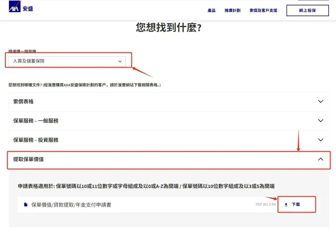 安盛提领需在网页版下载表格。在下载中心找到”提取保单价值”表格。