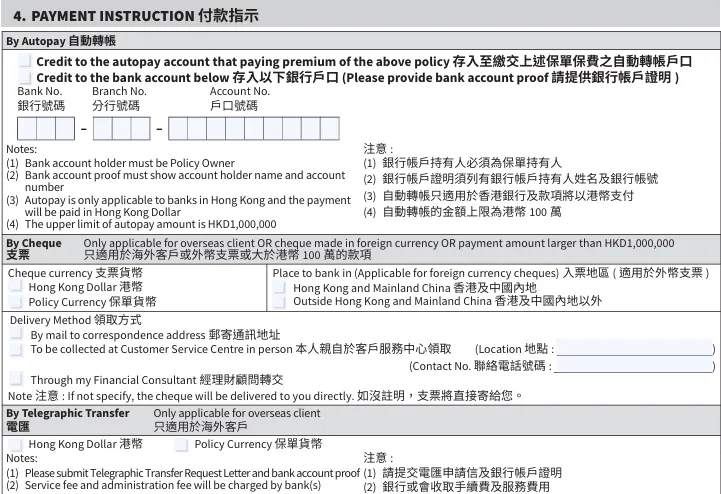 收款方式:自助转账(限港元,上限100万)、支票、电汇(仅海外客户)。
