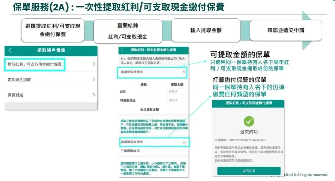 周大福APP提领步骤:保单服务→查询红利/可支取现金余额→输入金额→提交。