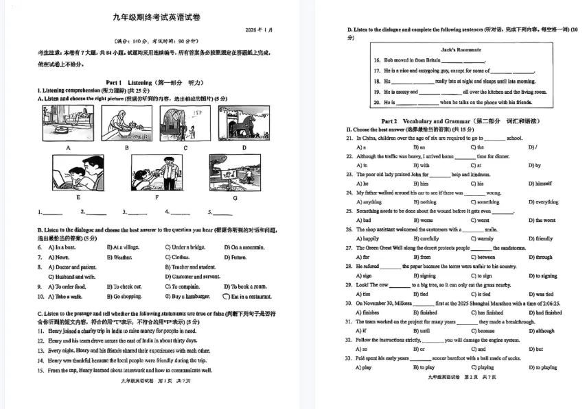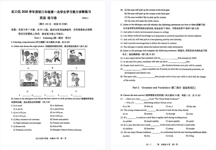 【PDF可下载】2026上海16区初三一模英语试卷+答案分享!