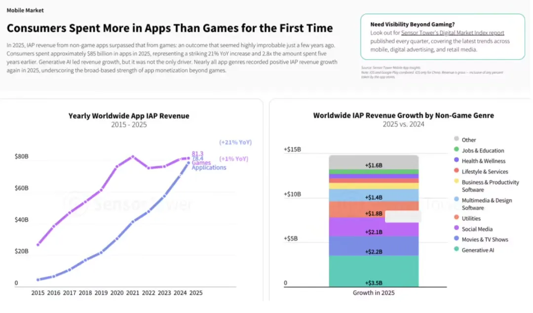 2025年全球游戏市场的整体玩家参与度依旧保持高位,全球玩家游戏总时长达到4446亿小时。值得关注的是,移动应用市场迎来历史性转变,消费者在非游戏类应用上的支出首次超过游戏应用,移动游戏市场则步入成熟期,行业发展逻辑发生新变化。