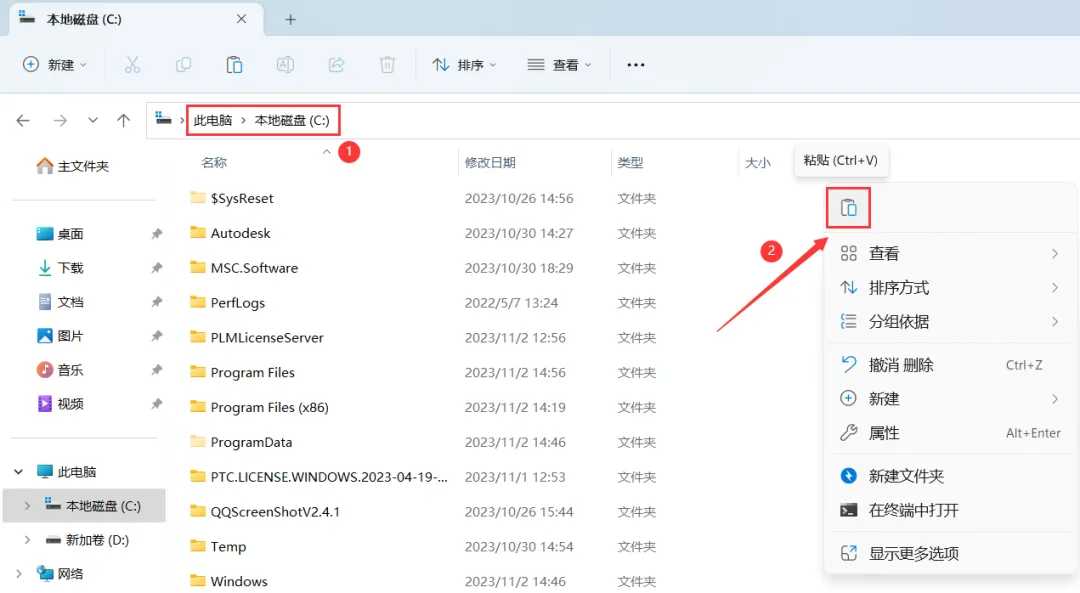 4、打开本地C盘,再右键文件夹的空白处,点击【粘贴按钮】
