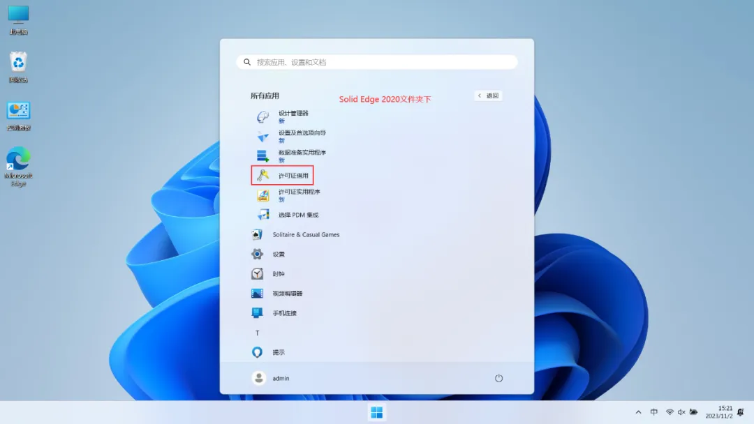 21、回到桌面,点击任务栏的【开始菜单】,在【所有应用】中找到【选择PDM集成图标】,单机运行它