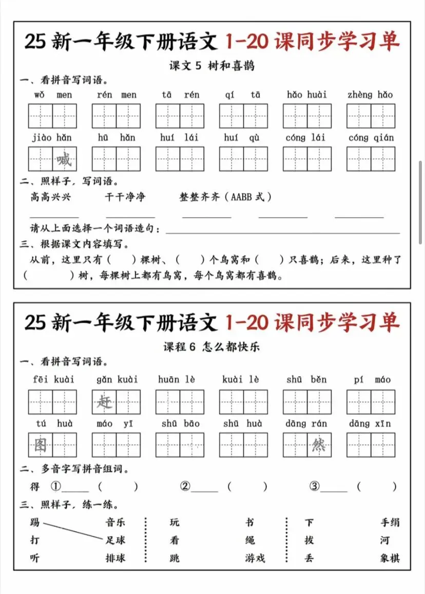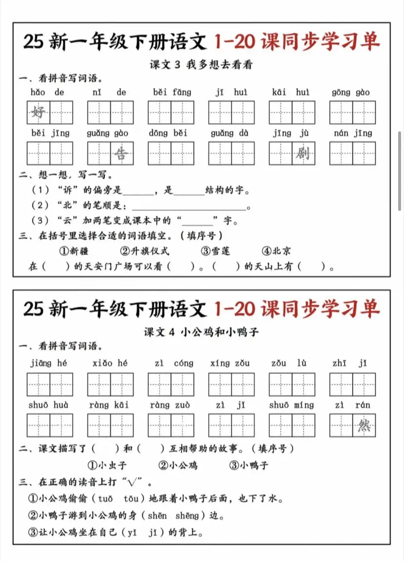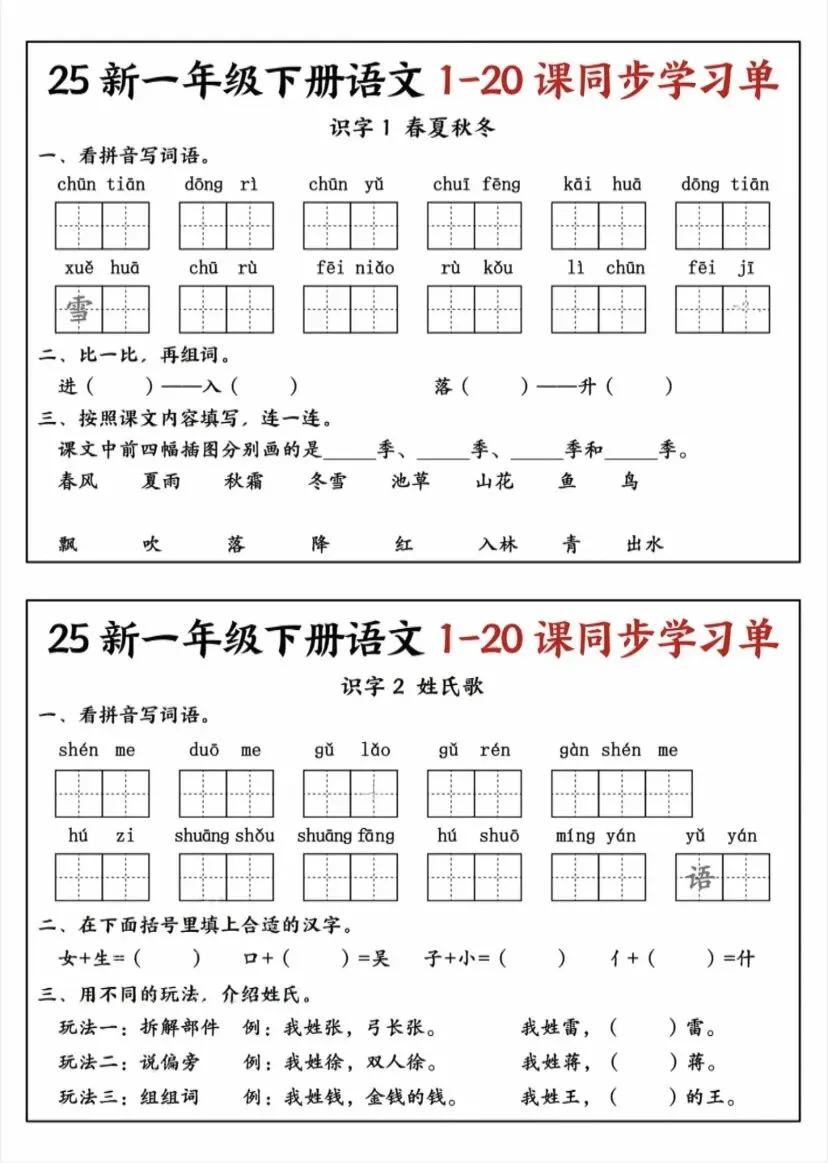 今天给大家整理了一份25新一年级下册语文1-20课同步学习单,覆盖了全册所有重点课文,包含看拼音写词语、比一比再组词、课文内容填空、笔顺练习等核心题型,完全贴合课本考点。