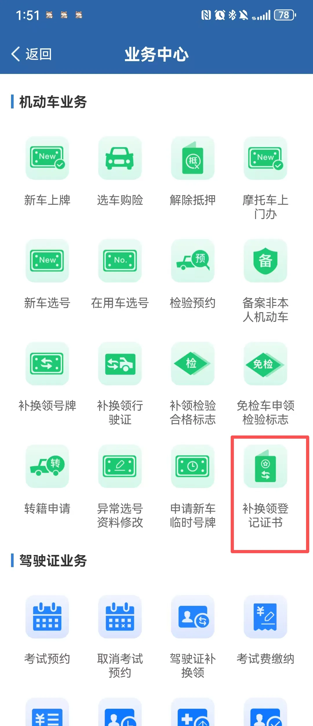 登录 “交管 12123”APP,首页点击【更多】进入【业务中心】,选择【机动车业务】中的【补换领登记证书】功能;