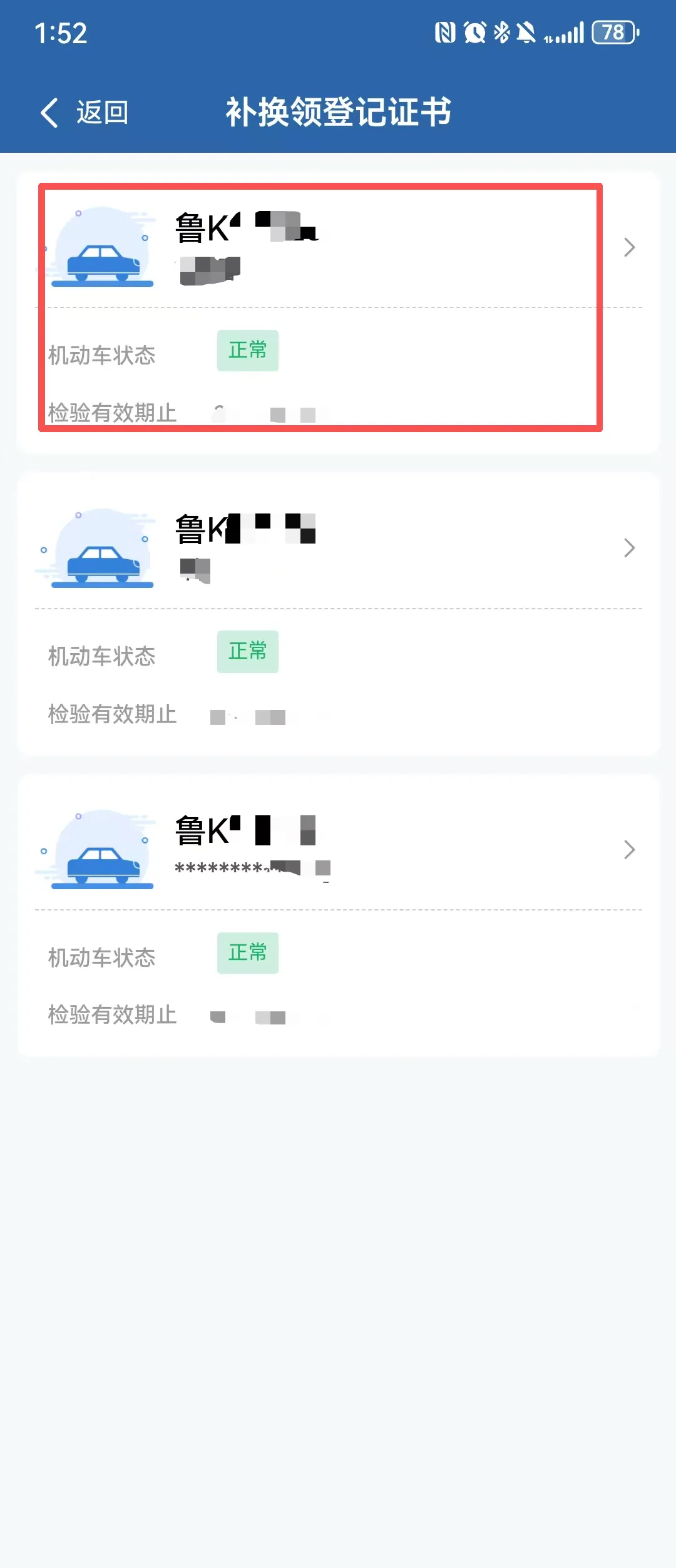 选择需要补换领机动车登记证书的车辆并阅读【业务须知】;