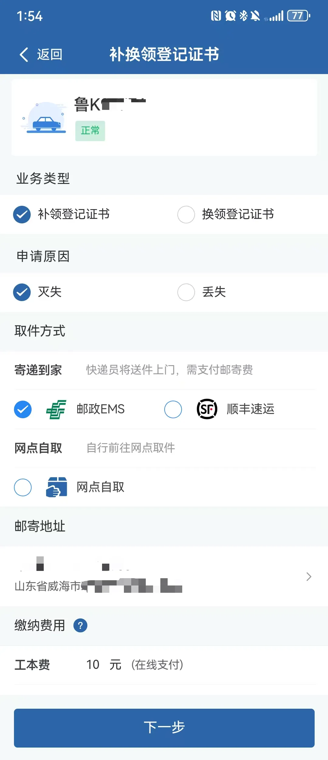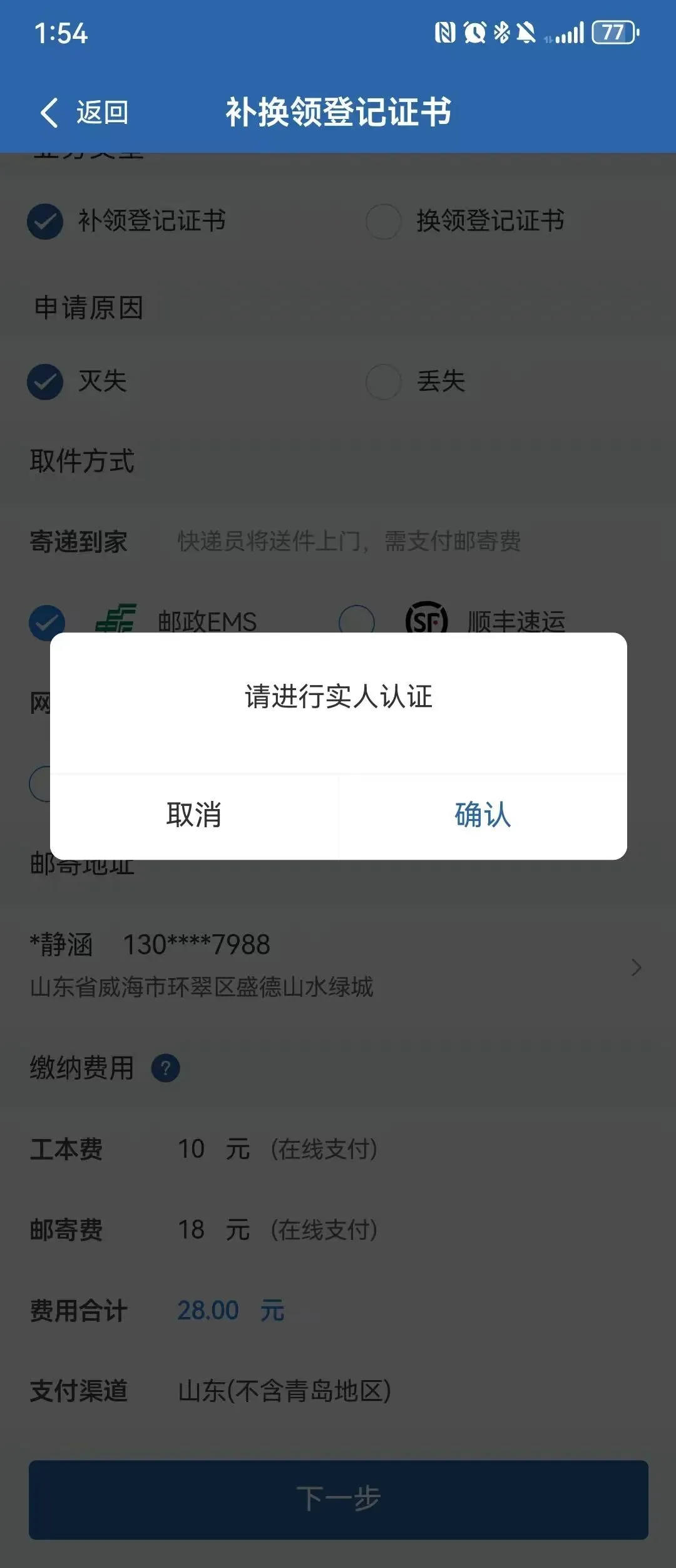 选择 【业务类型】、【申请原因】、【取件方式】,点击下一步,进行【实人认证】;