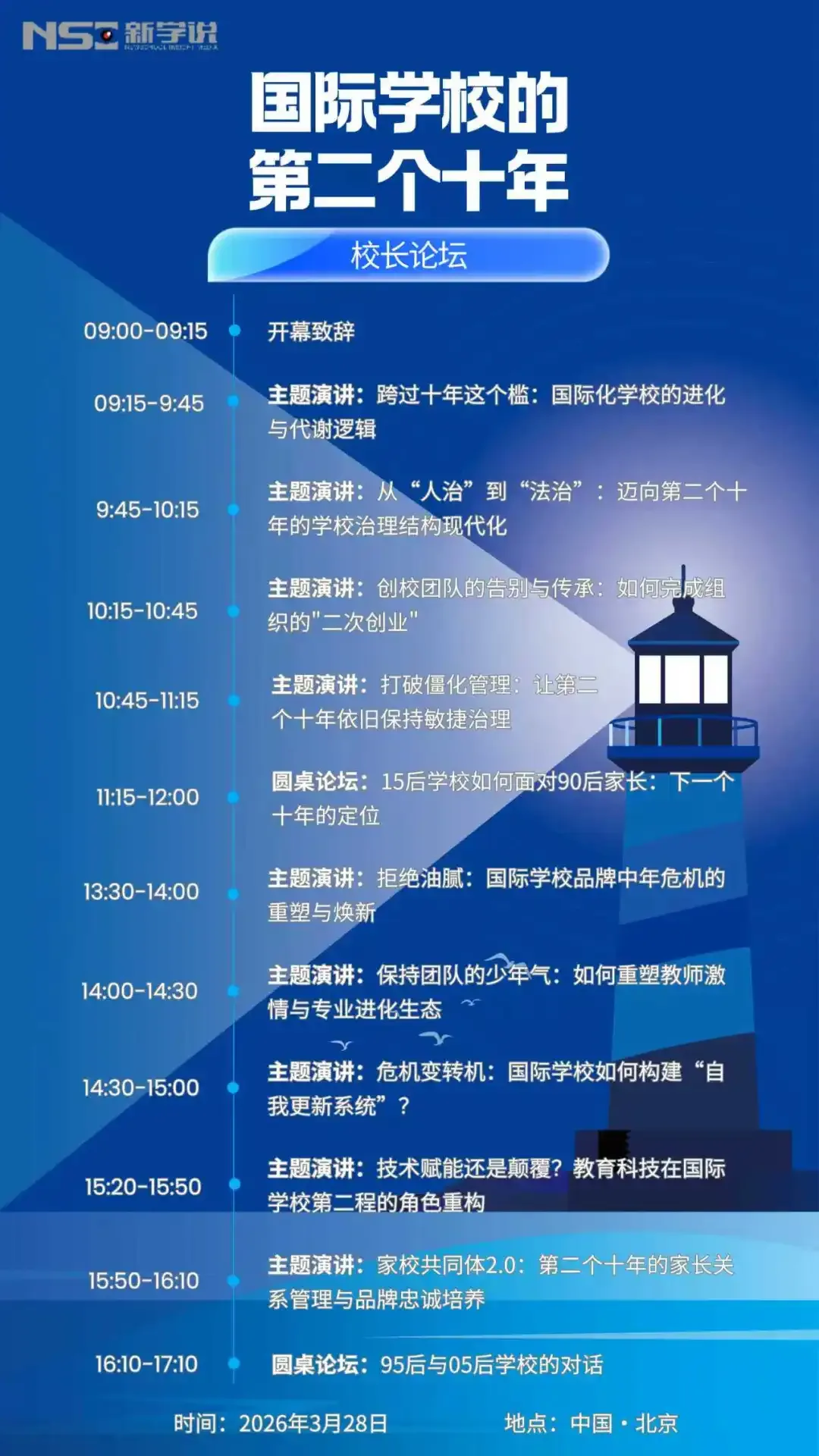 面对全新的行业发展阶段,闭门造车注定无法应对变局,孤军奋战更难穿越周期。为此,新学说将于 2026年3月28日,在北京举办 “国际学校的第二个十年–校长论坛”。