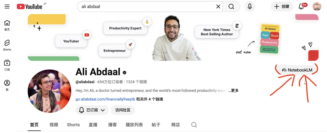 2. 搜索你想要学习的博主(比如 Ali Abdaal)