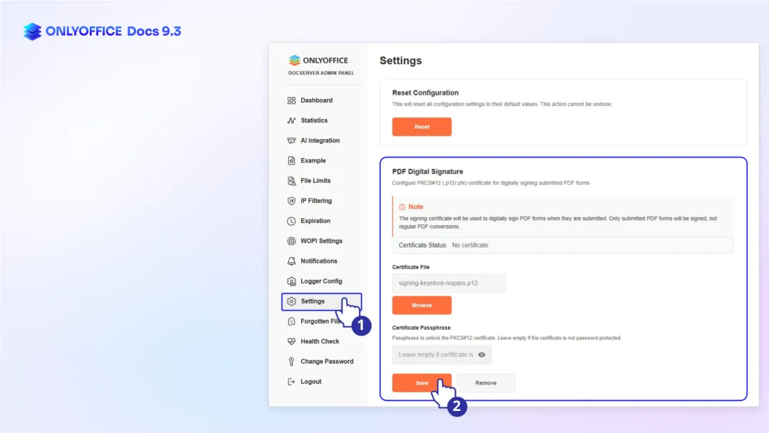ONLYOFFICE 文档企业版支持在管理面板上传签名证书,用于对 PDF 表单进行可信数字签名,确保文档可验证且防篡改。
