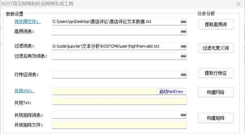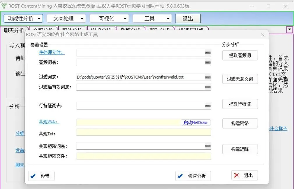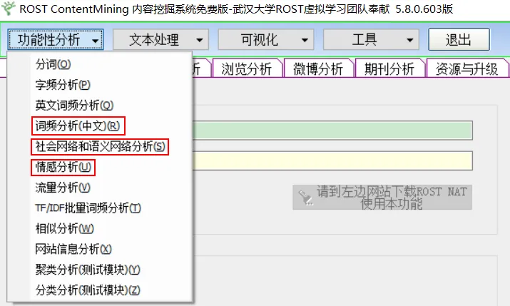 点击功能性分析下拉列表框中的社会网络分析选项,打开ROST语义网络和社会网络生成工具。