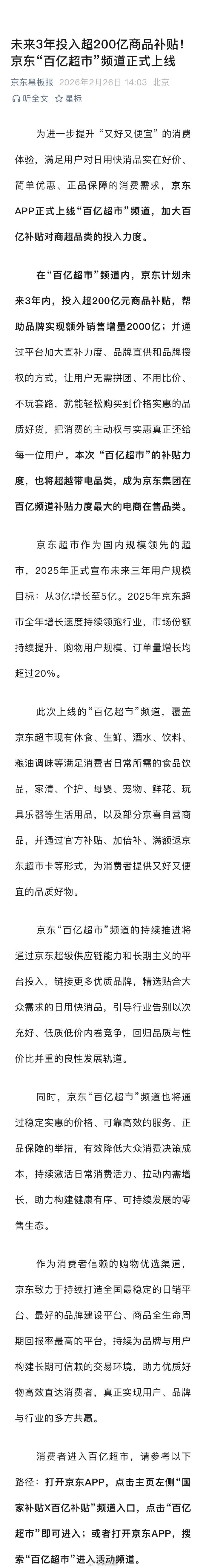 2月26日,据京东黑板报,京东APP正式上线“百亿超市”频道,加大百亿补贴对商超品类的投入力度。在“百亿超市”频道内,京东计划未来3年内,投入超200亿元商品补贴,帮助品牌实现额外销售增量2000亿;并通过平台加大直补力度、品牌直供和品牌授权的方式,让用户无需拼团、不用比价、不玩套路,就能轻松购买到价格实惠的品质好货。补贴力度也将超越带电品类,成为京东集团在百亿频道补贴力度最大的电商在售品类