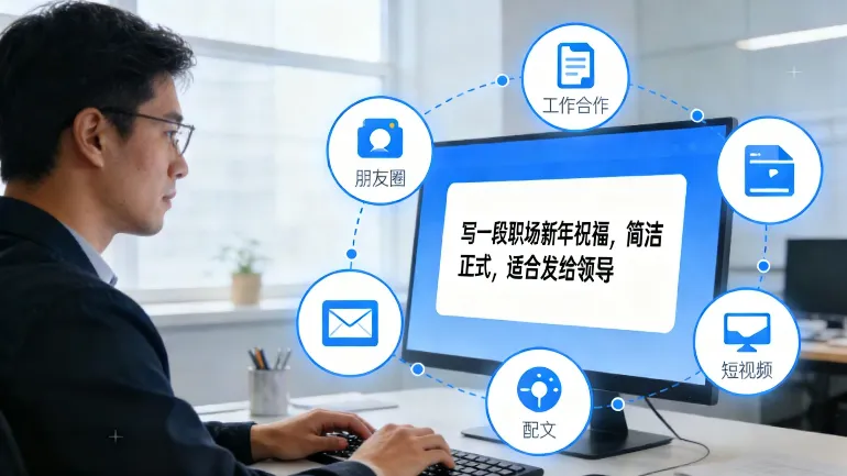 用法:输入需求(比如“写一段职场新年祝福,简洁正式,适合发给领导”),AI会直接生成,你可以根据自己的需求修改,不用从零开始写。