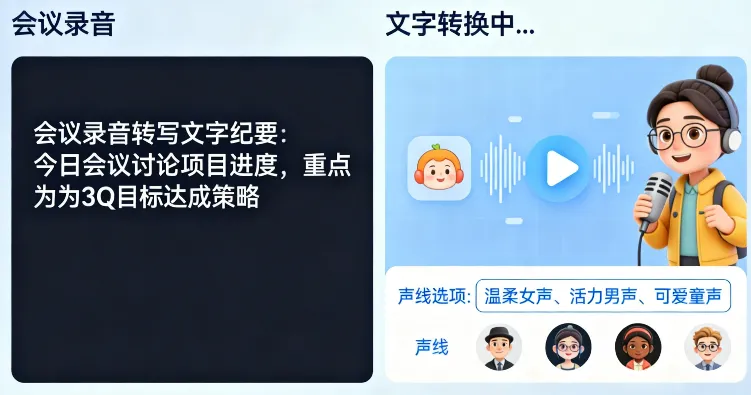 核心作用:处理“语音和文字”的转换,比如语音转文字(会议录音转纪要、说话转文字)、文字转语音(把文案变成配音,适合短视频、有声书)、语音合成(改变声音风格,比如变成卡通音、沉稳音)。