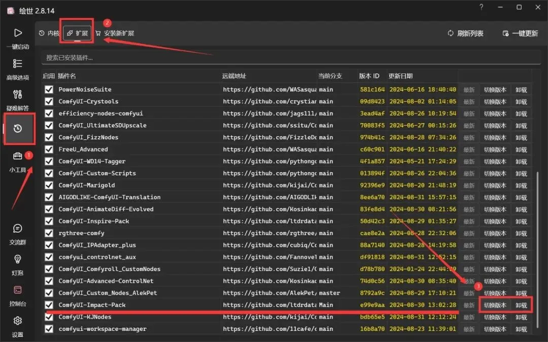 找到了“社恐”的源头,我的是ComfyUI-Impact-Pack节点,就以它为例,我们就要给它做“形象升级”。找来托尼老师,去换身行头,托尼老师家住在版本管理下的扩展,揪出问题节点,点击右边的更新,或者卸载重装,托尼老师三下五除二就解决了。