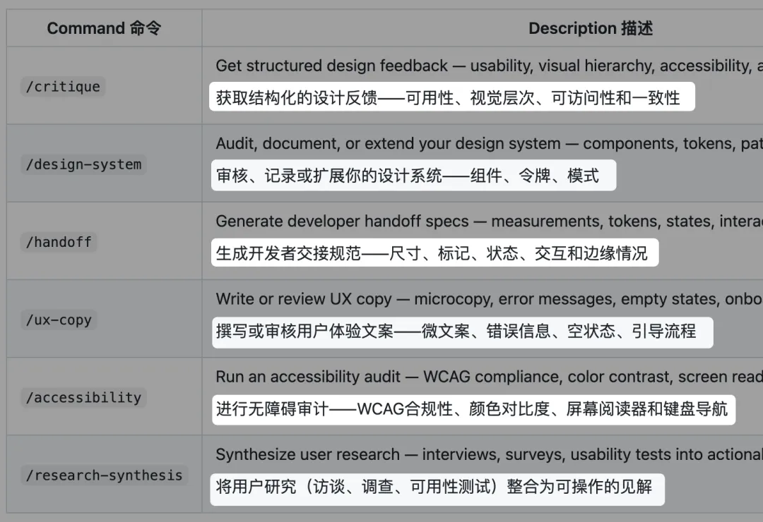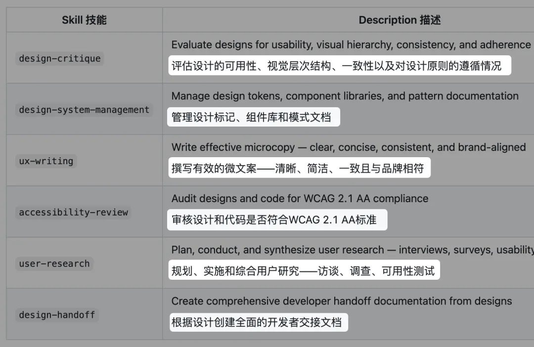 可以帮你做设计评审、写UX文案、跑无障碍审查、整理用研洞察、准备开发交接文档。输出的内容用的是设计师的语言,不是外行视角的泛泛建议。