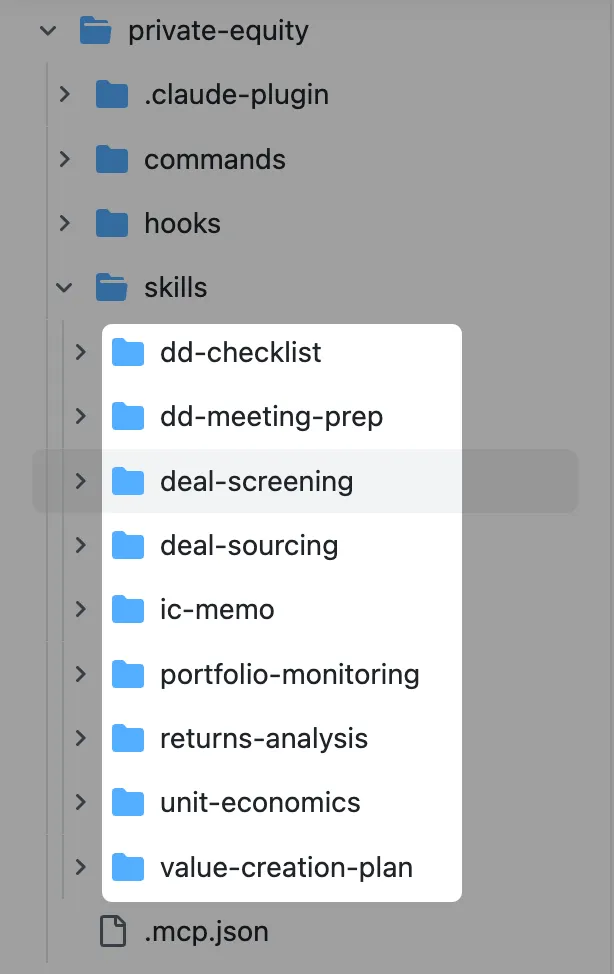 私募股权插件:deal sourcing和尽调支持。能审查大量文档、提取标准化财务数据、建模场景、根据投资标准评分机会。