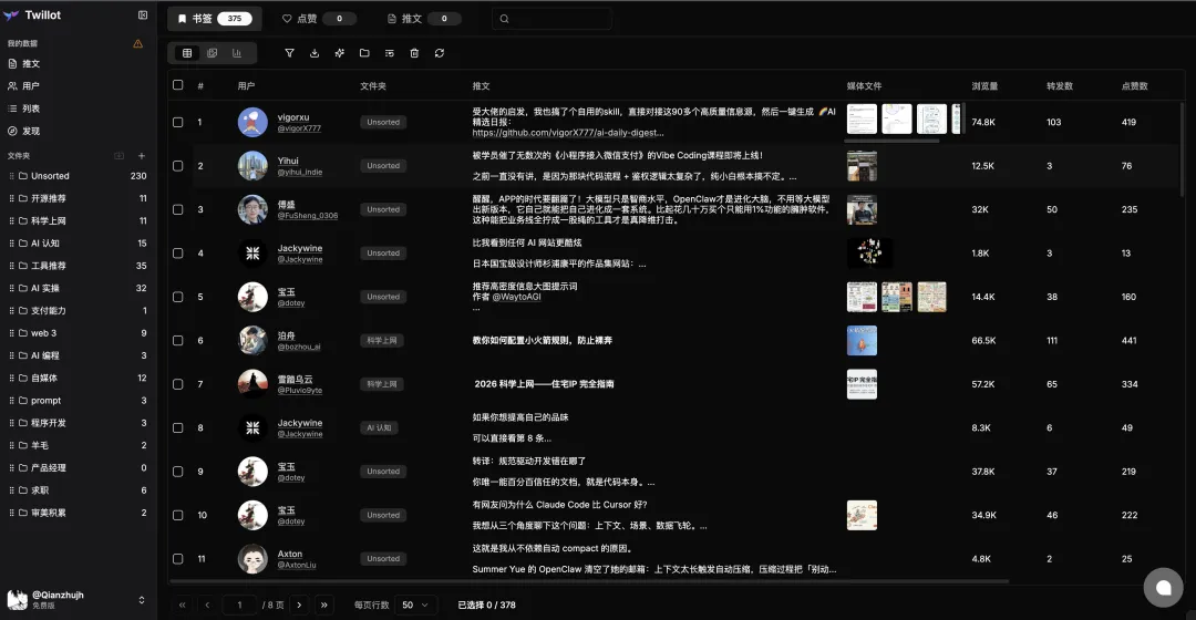 书签分类、内容搜索、博主帖子整理、视频下载都能做,是一个很全能的推特陪伴型工具。