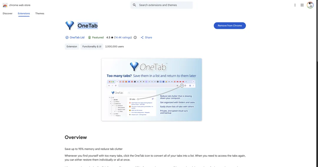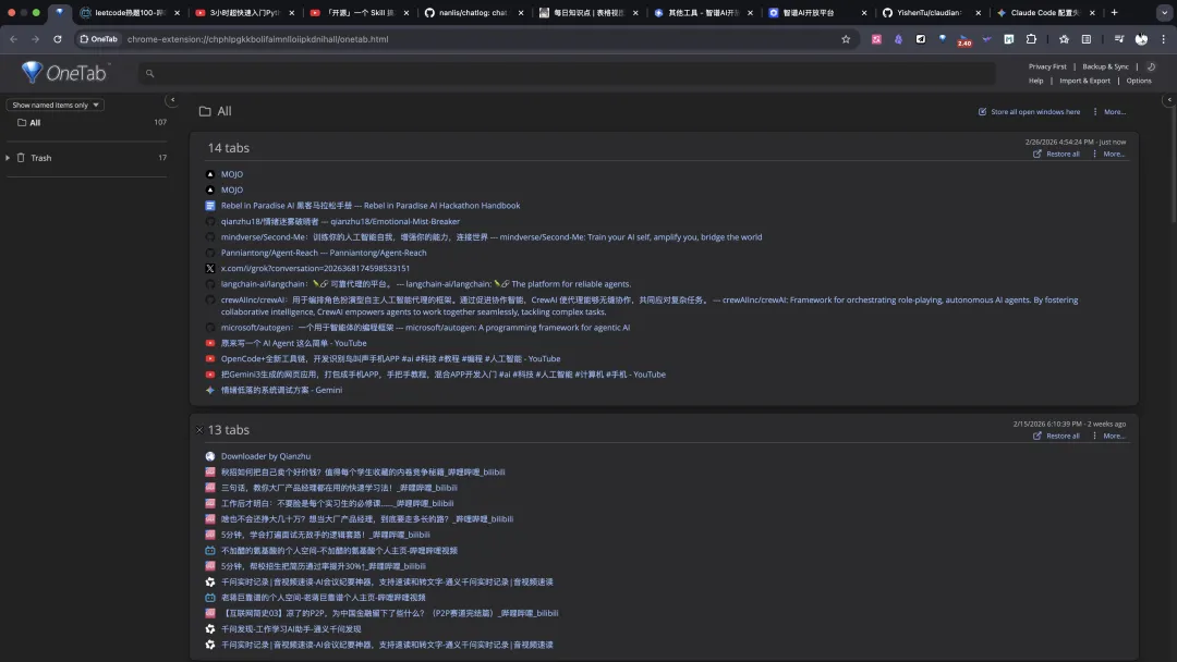 OneTab 可以把标签页收拢成清单,分类管理更清爽,也能顺手省一部分资源。