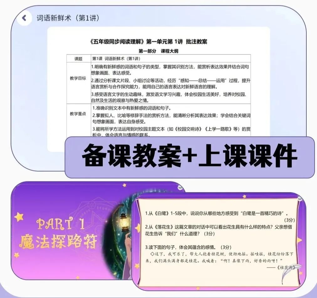 配套课件、习题、教案等素材,老师拿来即用,快速上手授课;同时依托AI技术,内容可随时更新,紧跟教材变化和教学趋势,兼顾语文为主、多学科配套的全科定制需求,真正实现“省心备课、高效授课”。