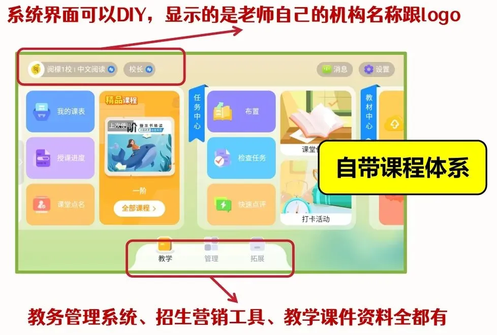 2、一方面,APP可植入机构专属LOGO和教学系统,打造独一无二的中文教学专属IP,强化机构的品牌辨识度,让家长和学员感受到机构的专业性,在众多同行中快速脱颖而出。