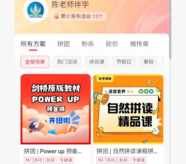 3、另一方面,APP内置强大的拓客功能,拼团、秒杀、体验课等招生活动一键生成,无需额外搭建平台,操作简单易上手,帮助机构快速吸引新学员,降低拓客成本。