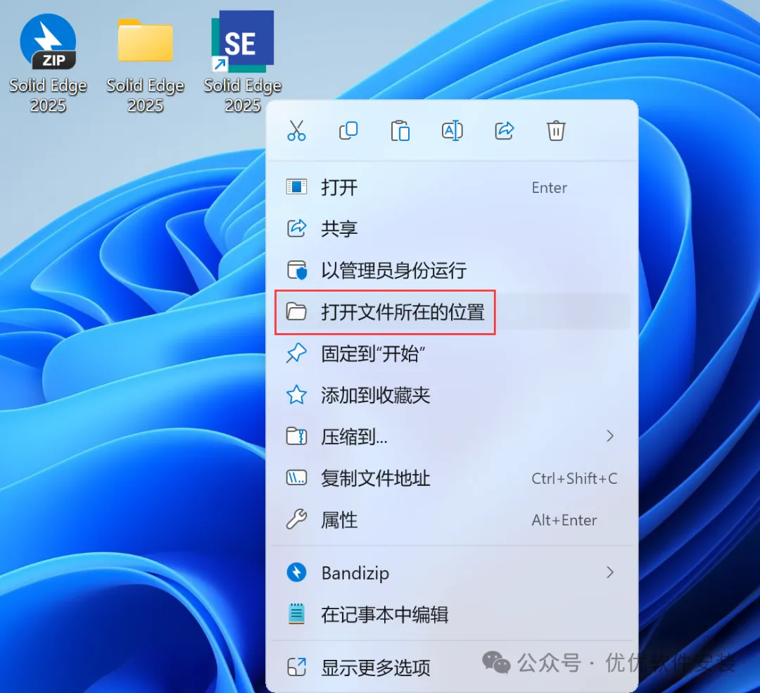 11、回到桌面,右键桌面上的【Solid Edge 2025软件图标】,点击【打开文件所在的位置】