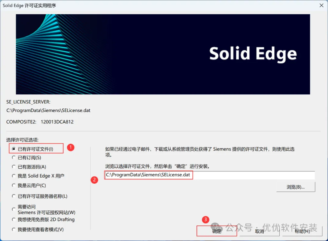 21、勾选【已有许可证文件】,路径填:C:\ProgramData\Siemens\ SELicense.dat,再点击【确定】