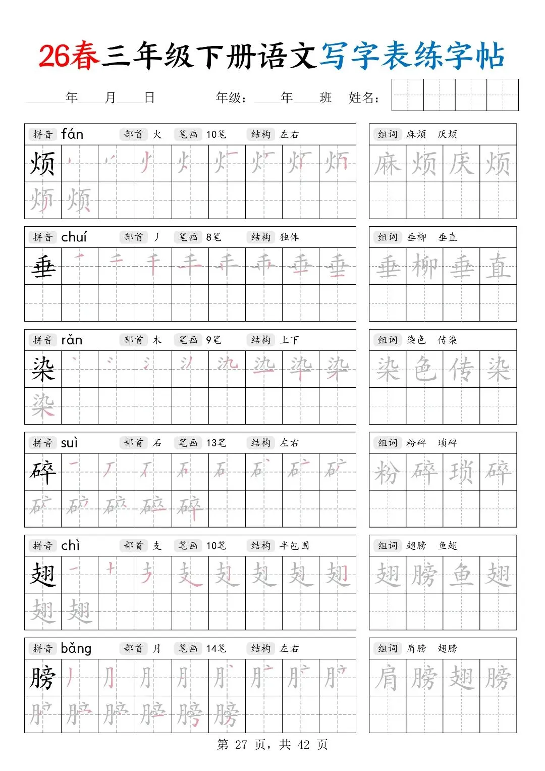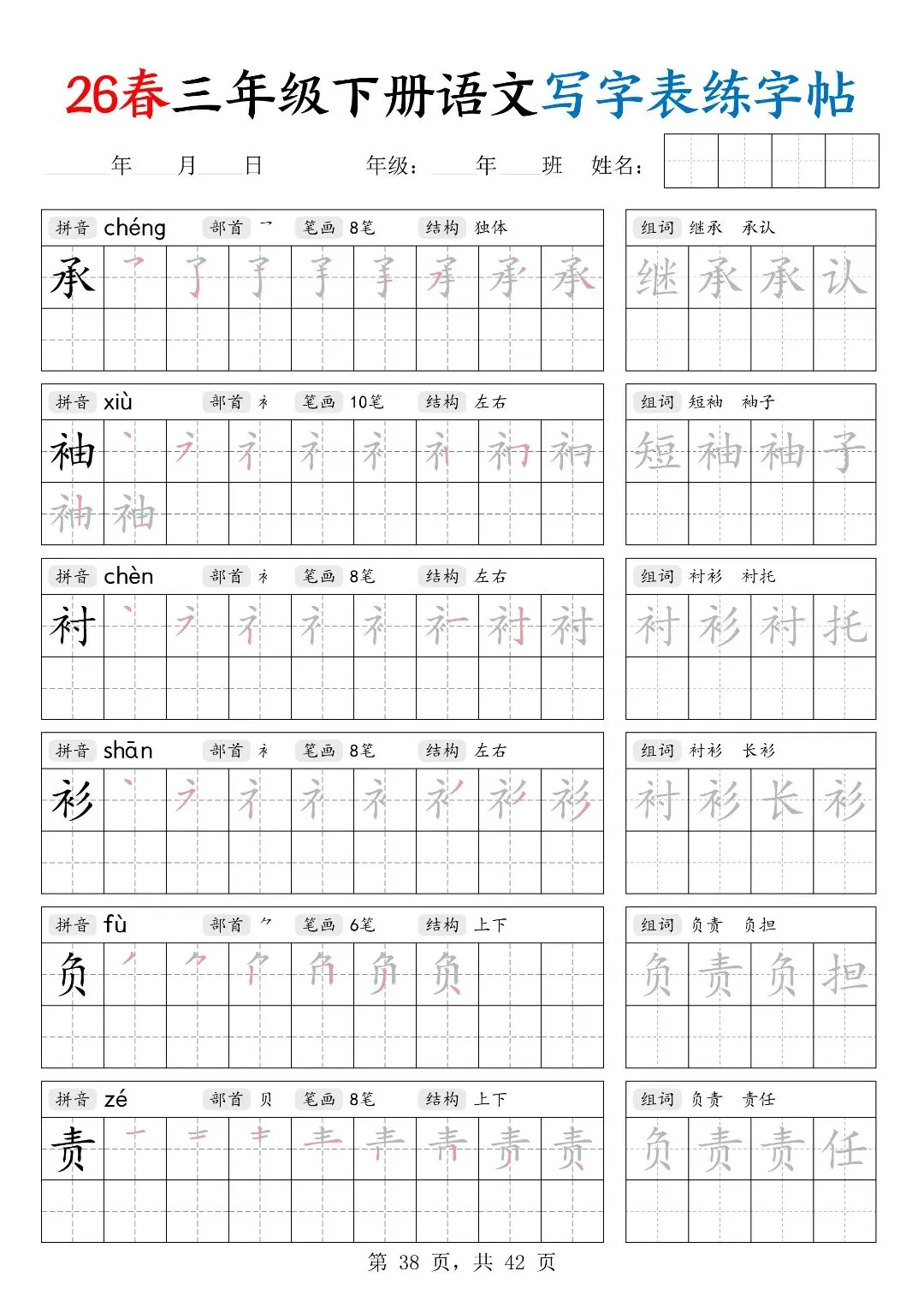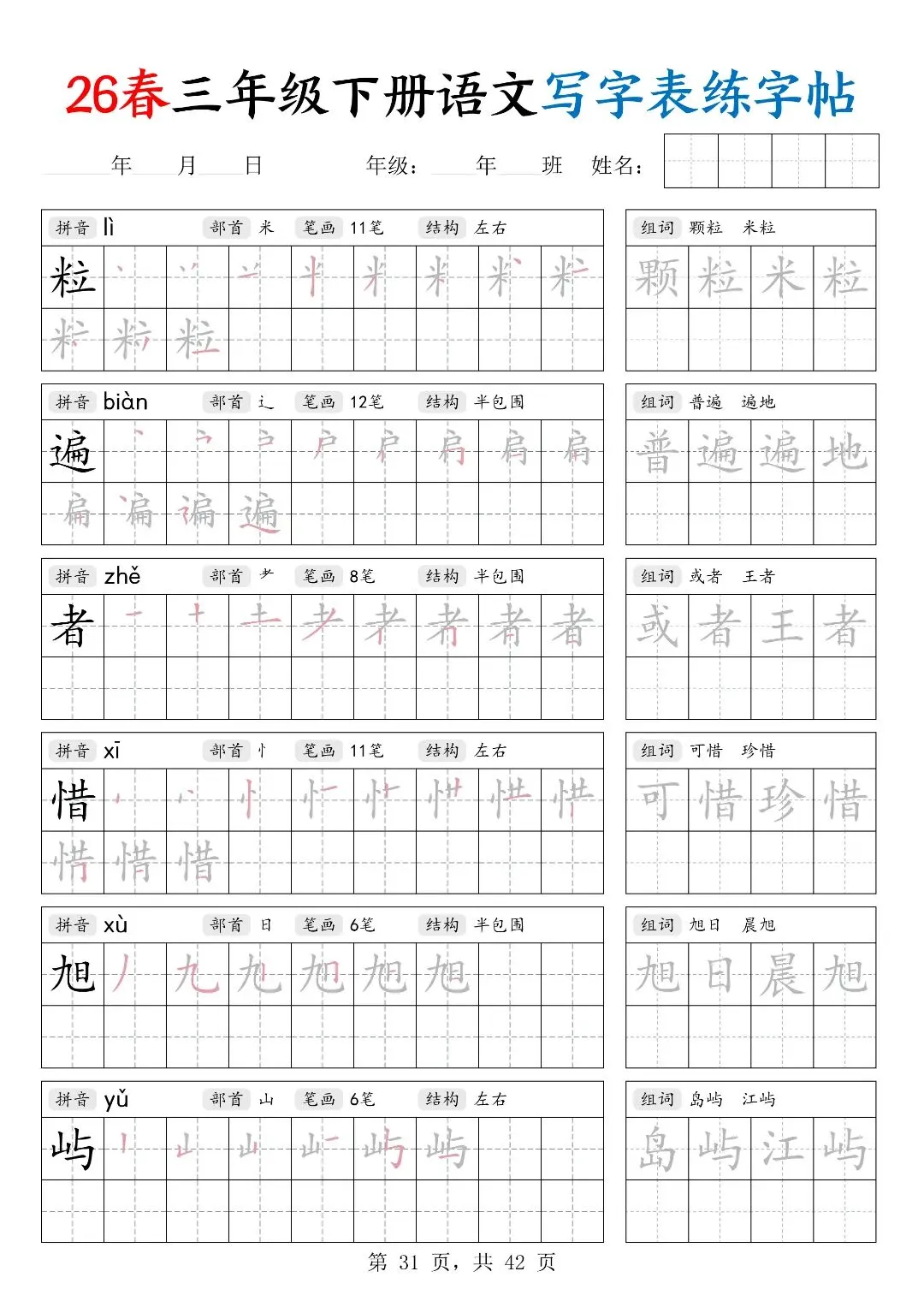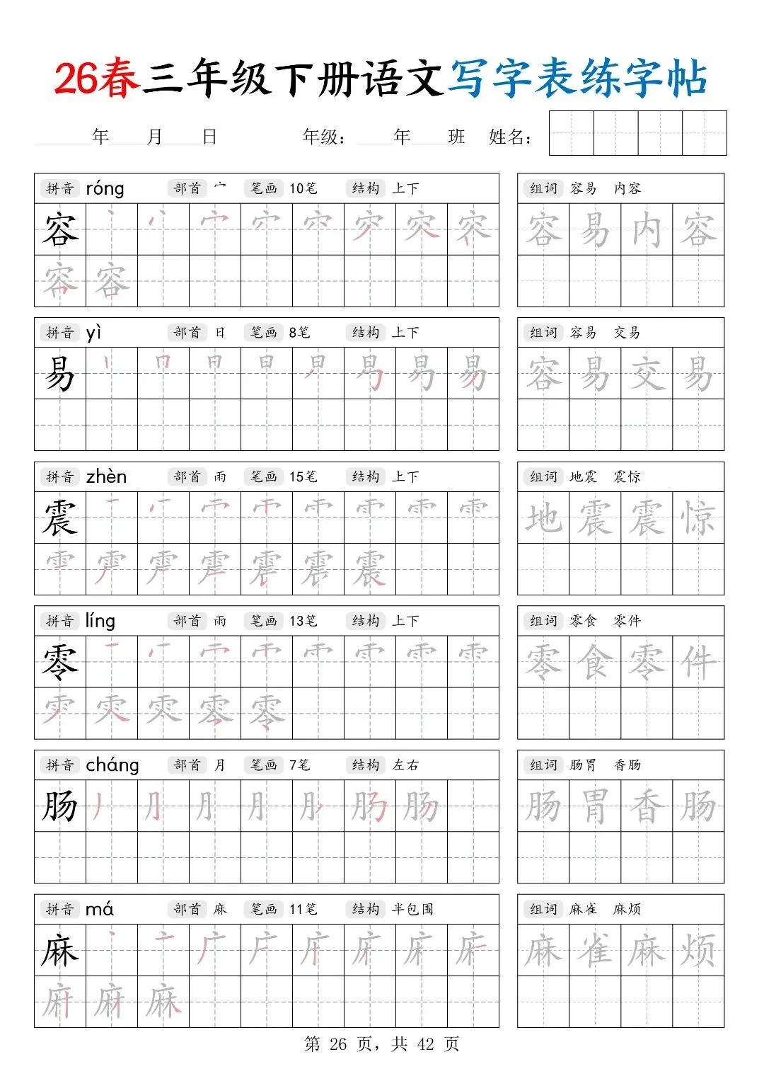 26春三年级下册人教部编版【语文写字表字帖】|完整电子版可打印