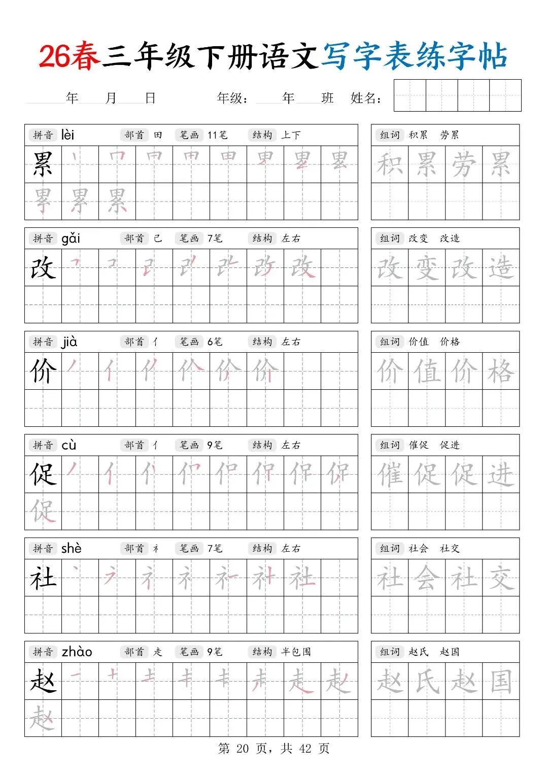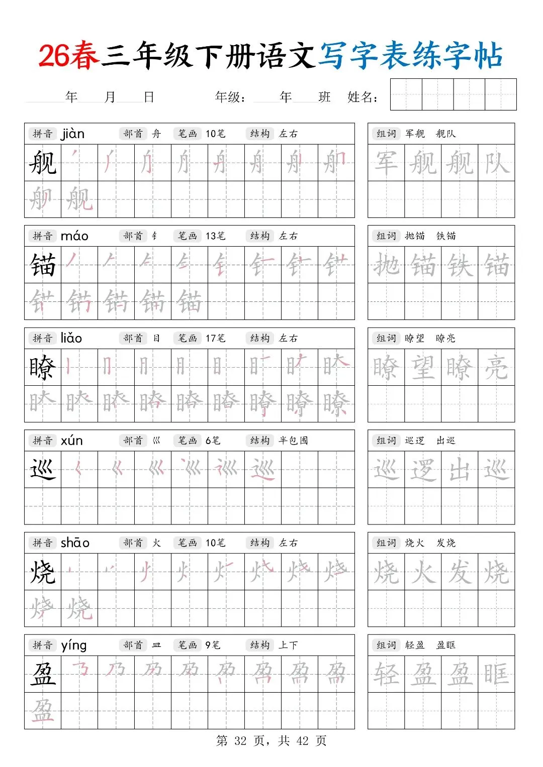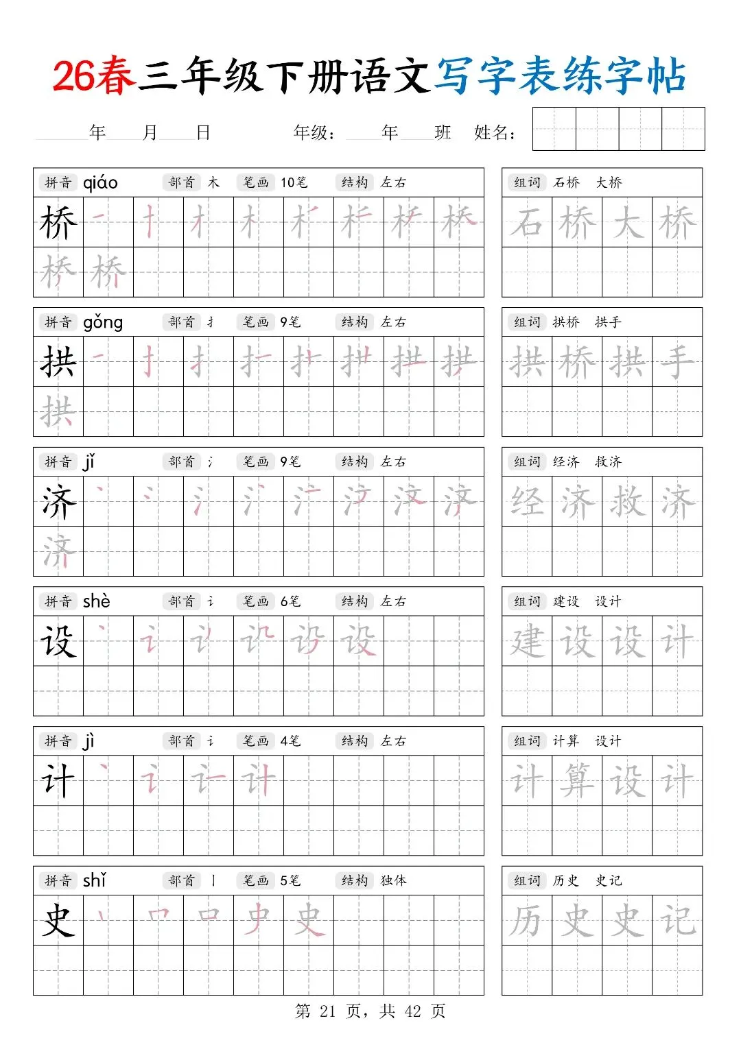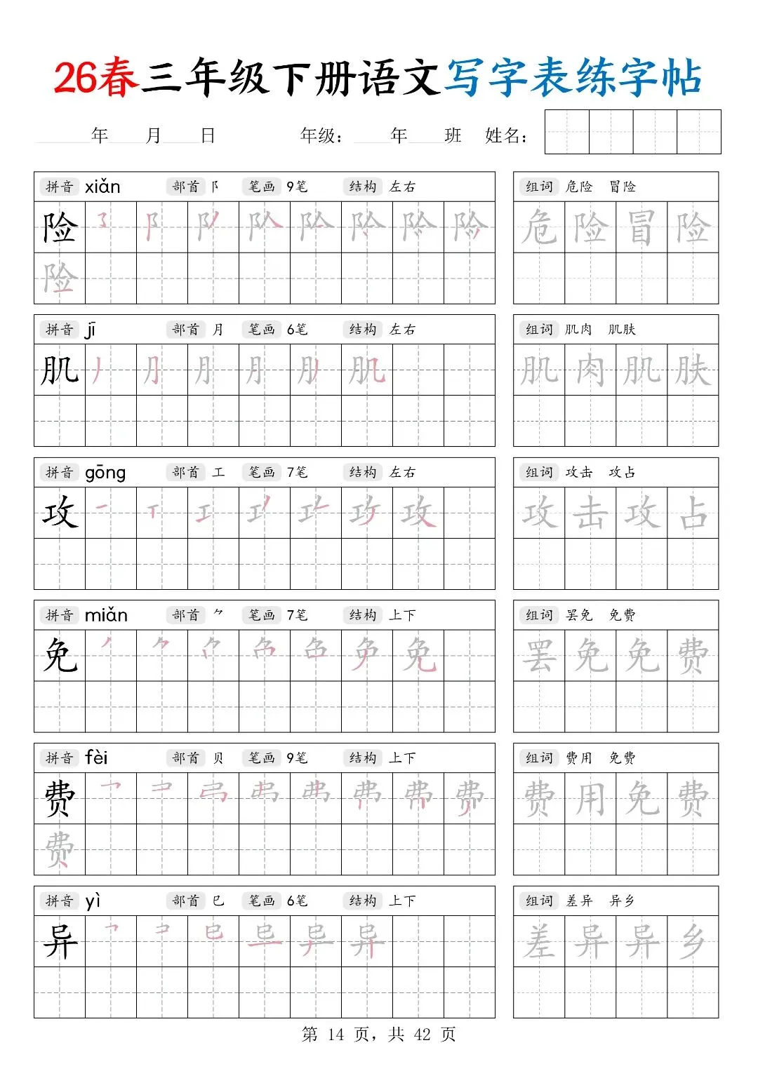 26春三年级下册人教部编版【语文写字表字帖】|完整电子版可打印
