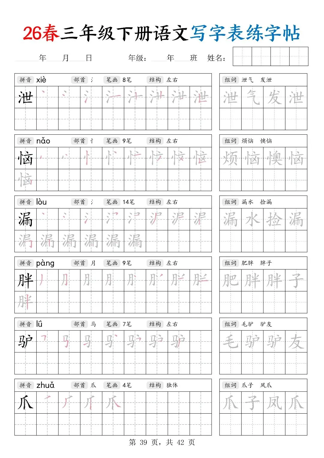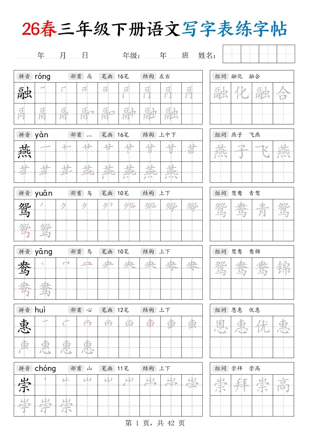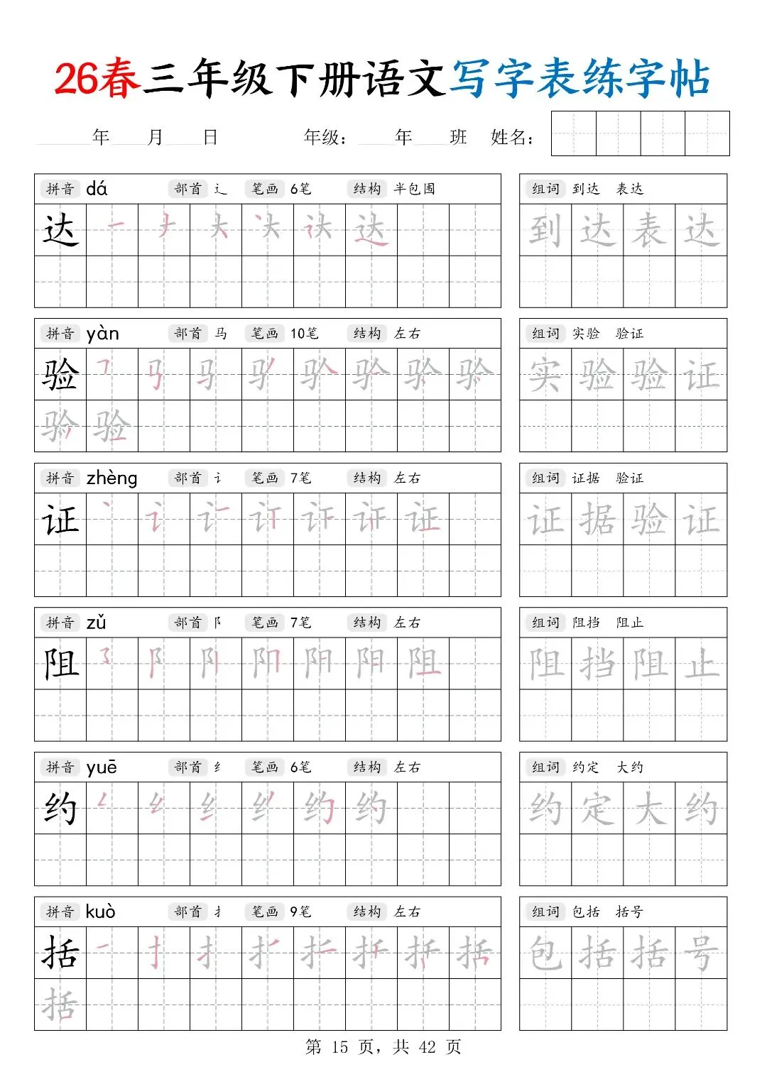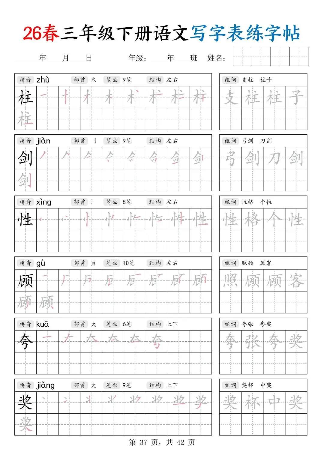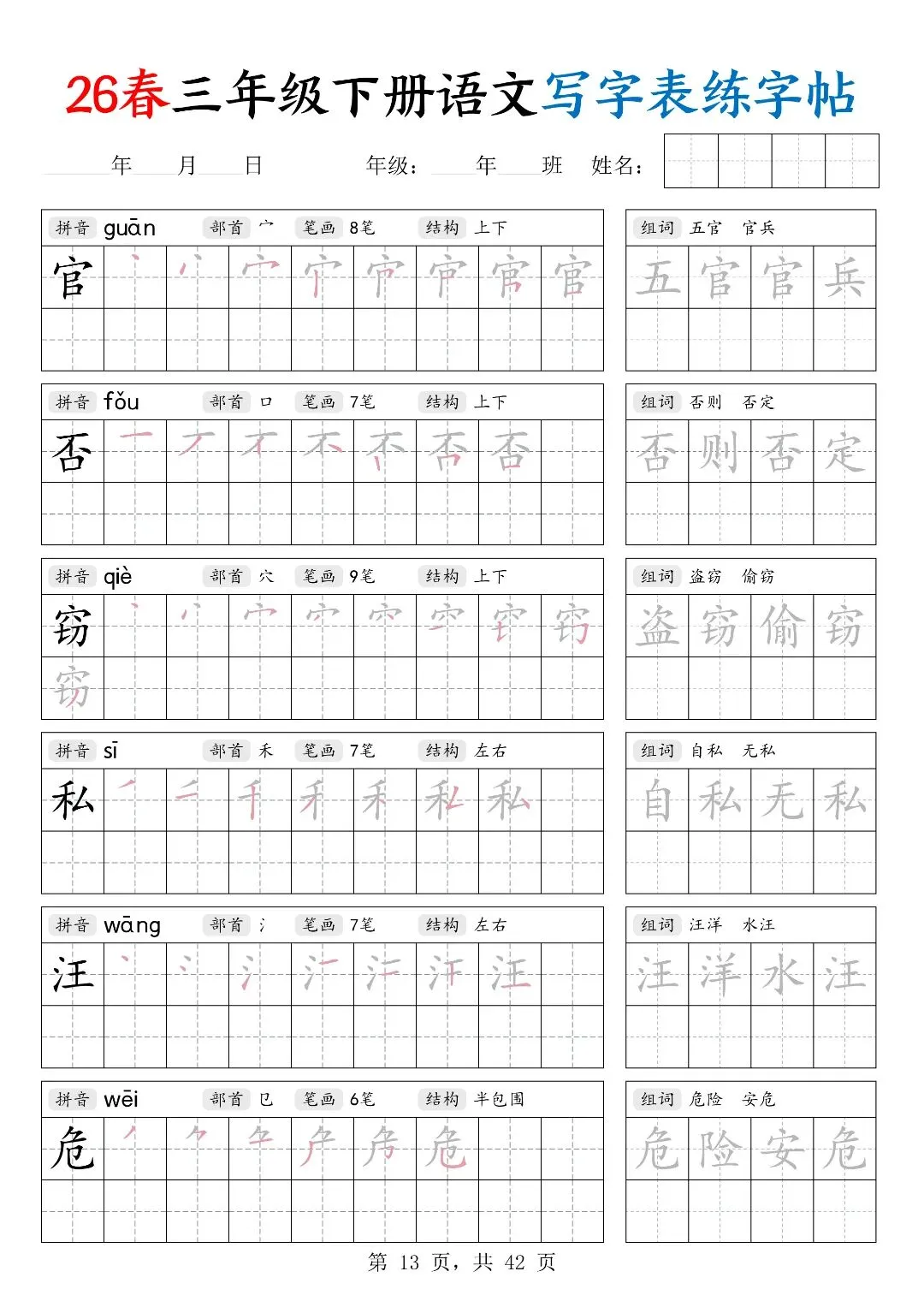 26春三年级下册人教部编版【语文写字表字帖】|完整电子版可打印