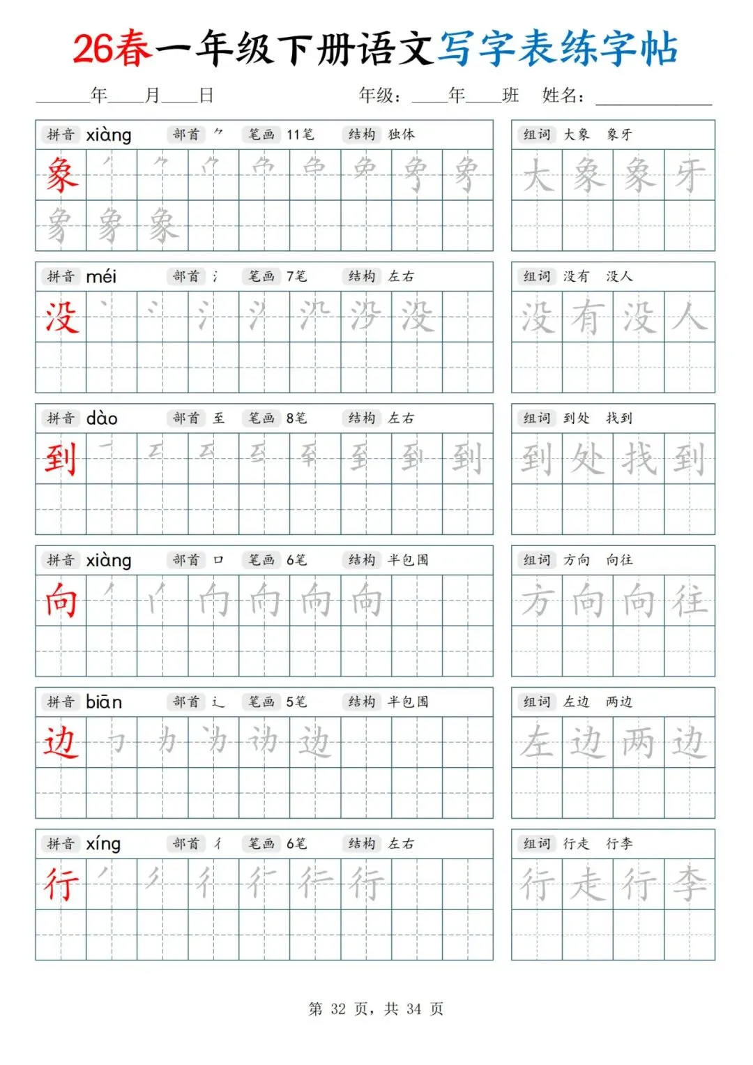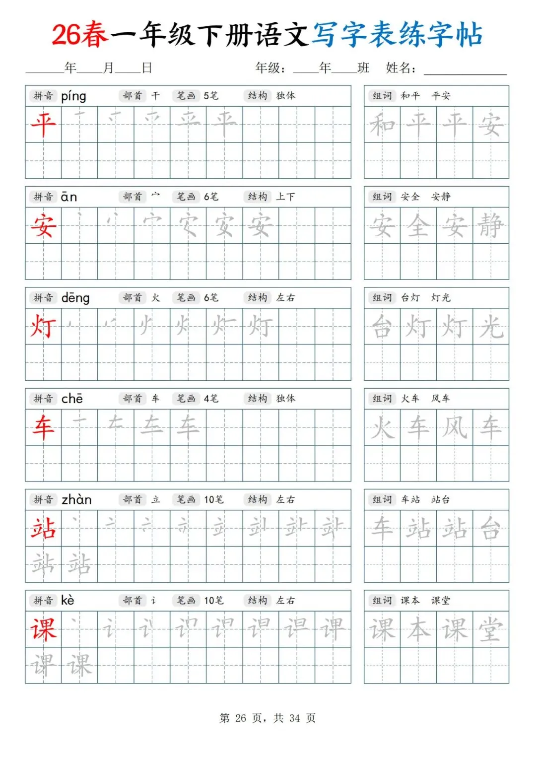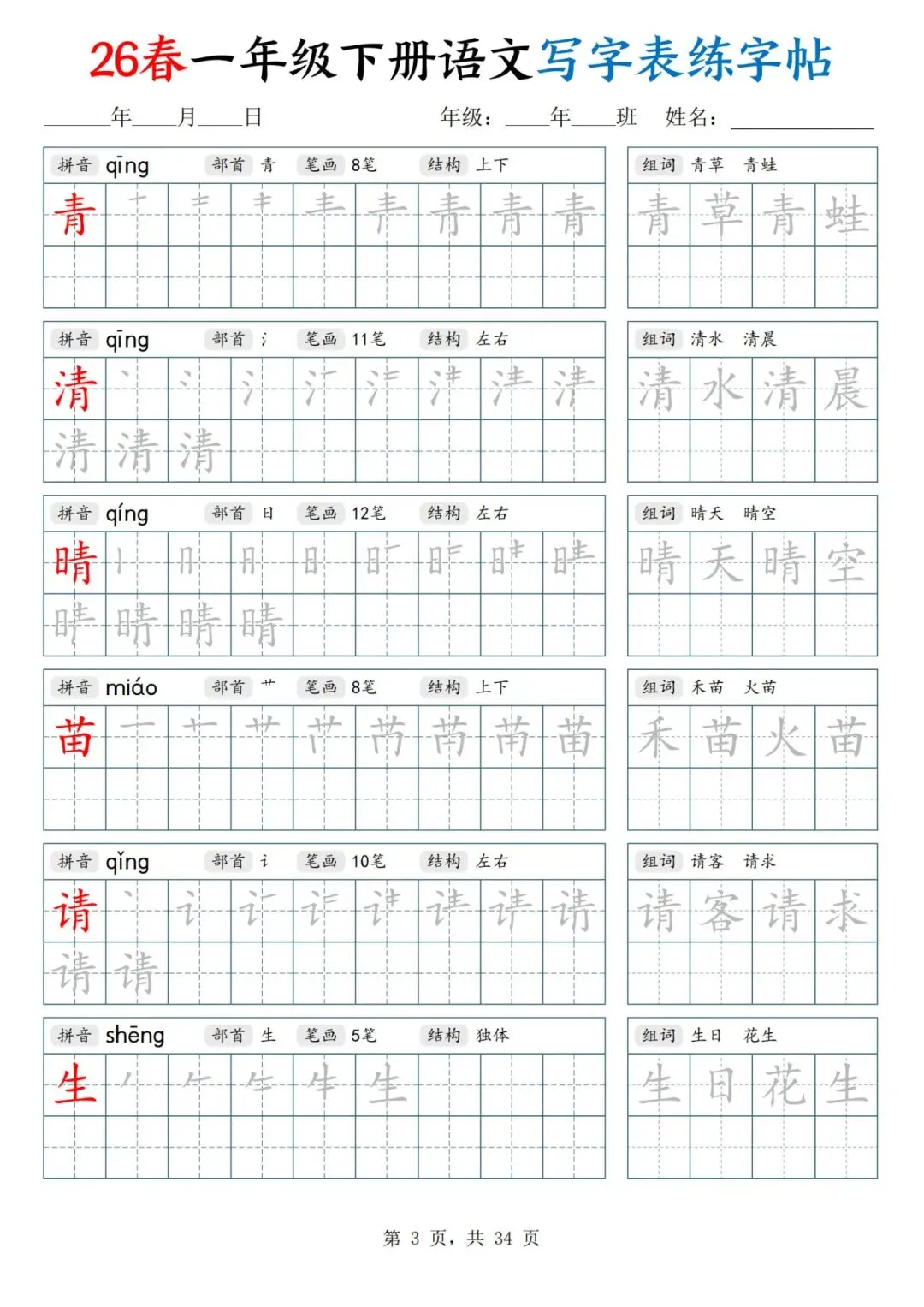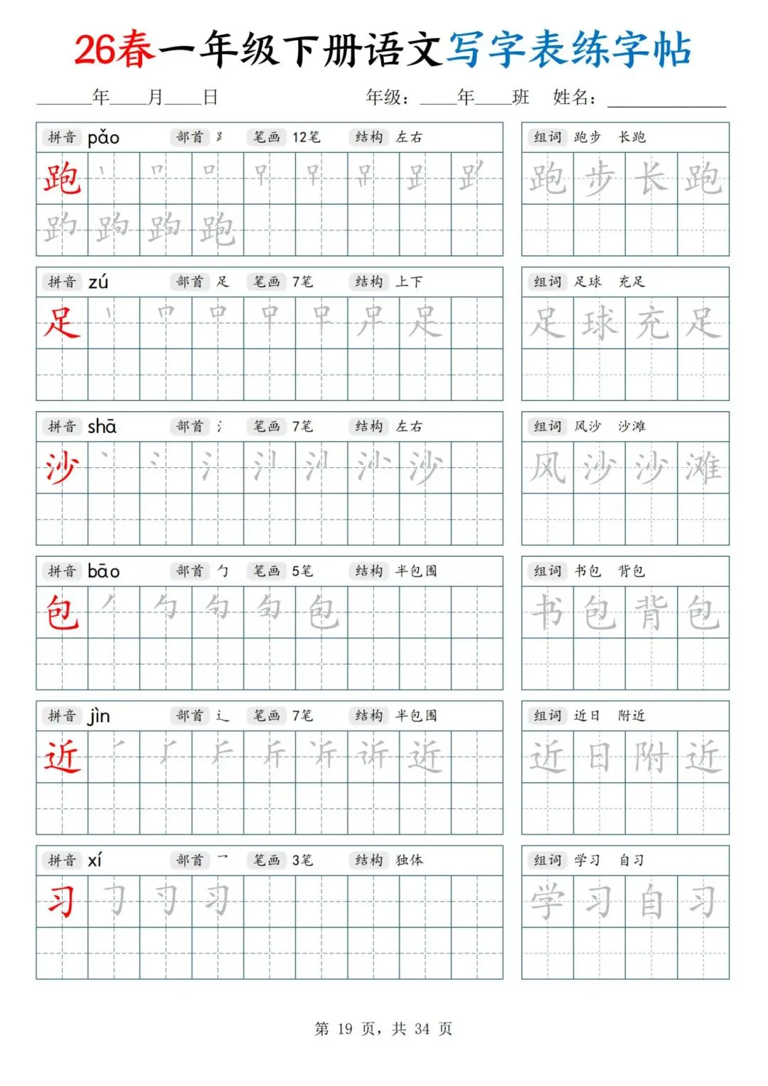 26春一年级下册人教部编版【语文写字表字帖】|完整电子版可打印
