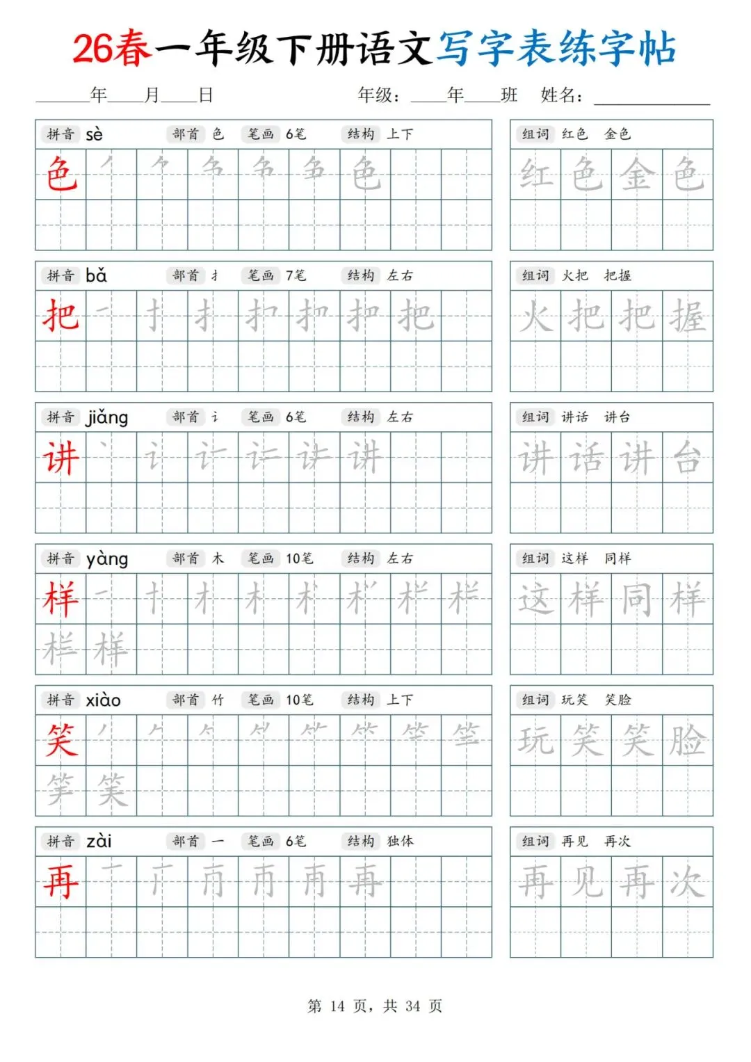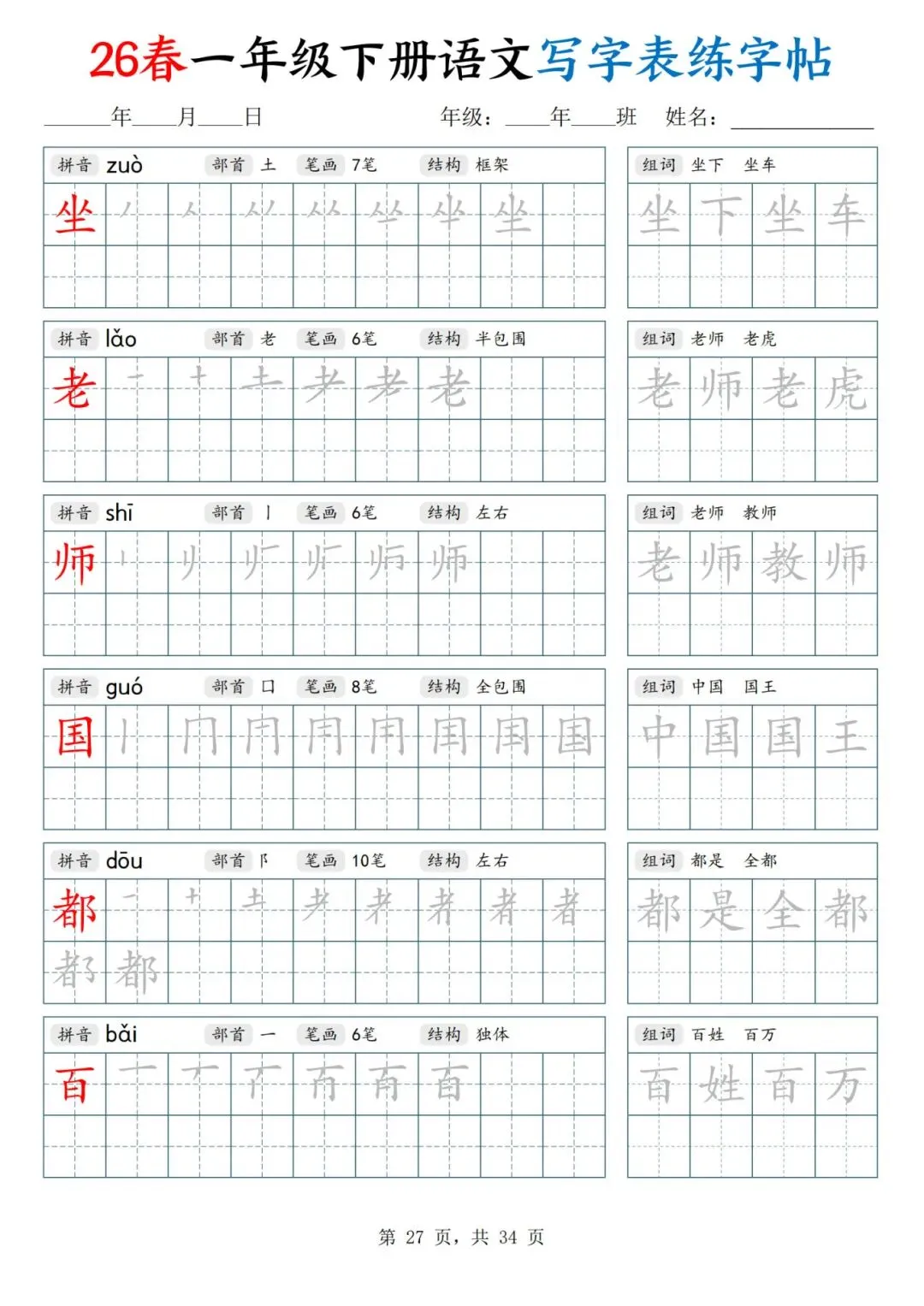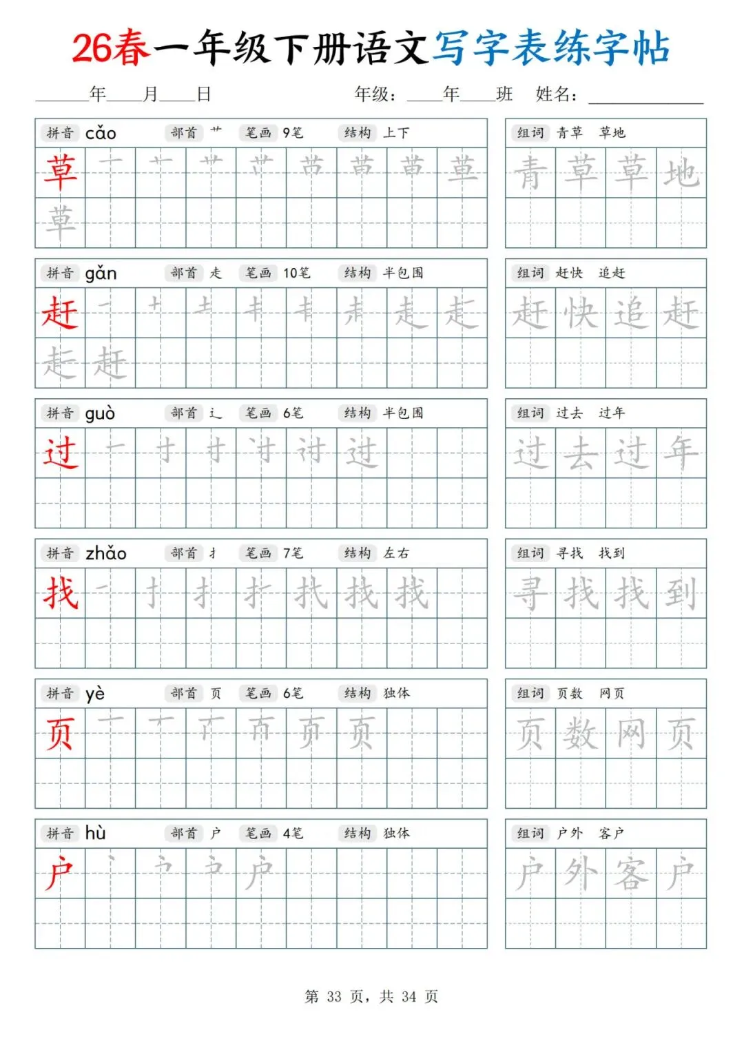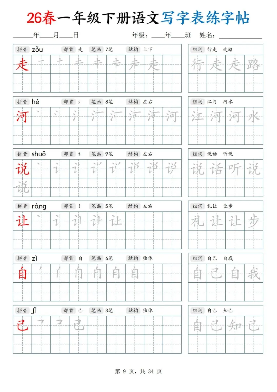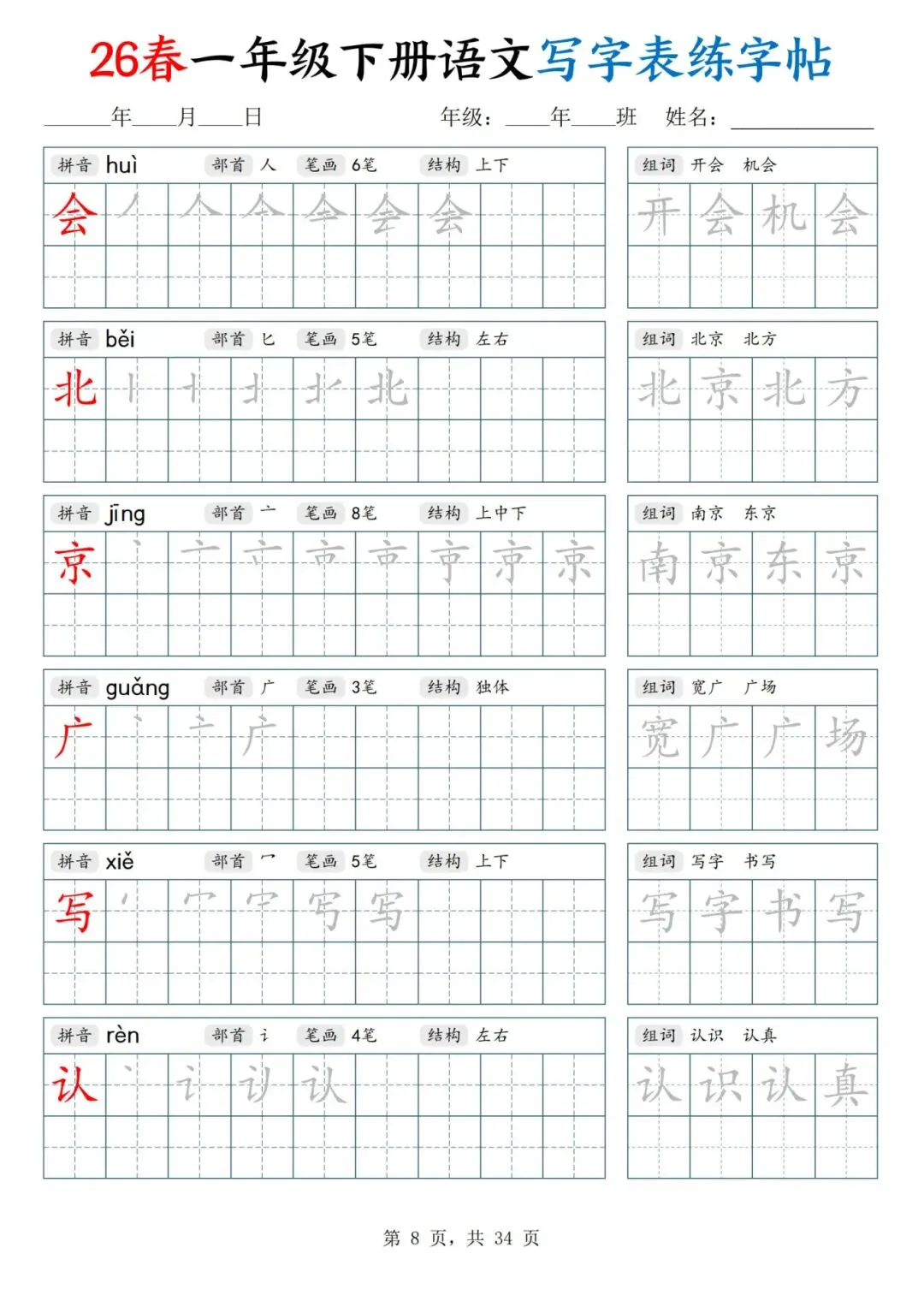 26春一年级下册人教部编版【语文写字表字帖】|完整电子版可打印