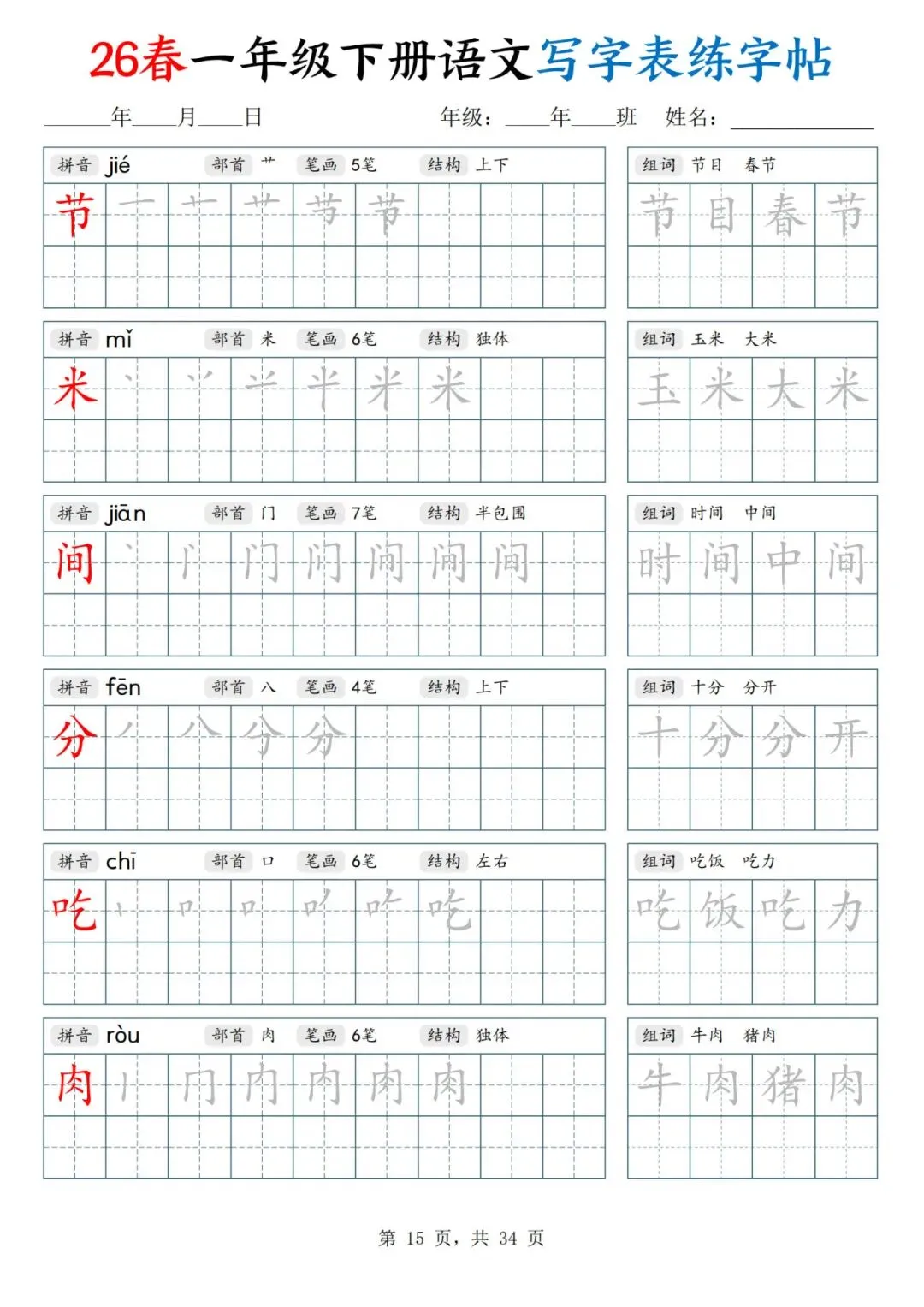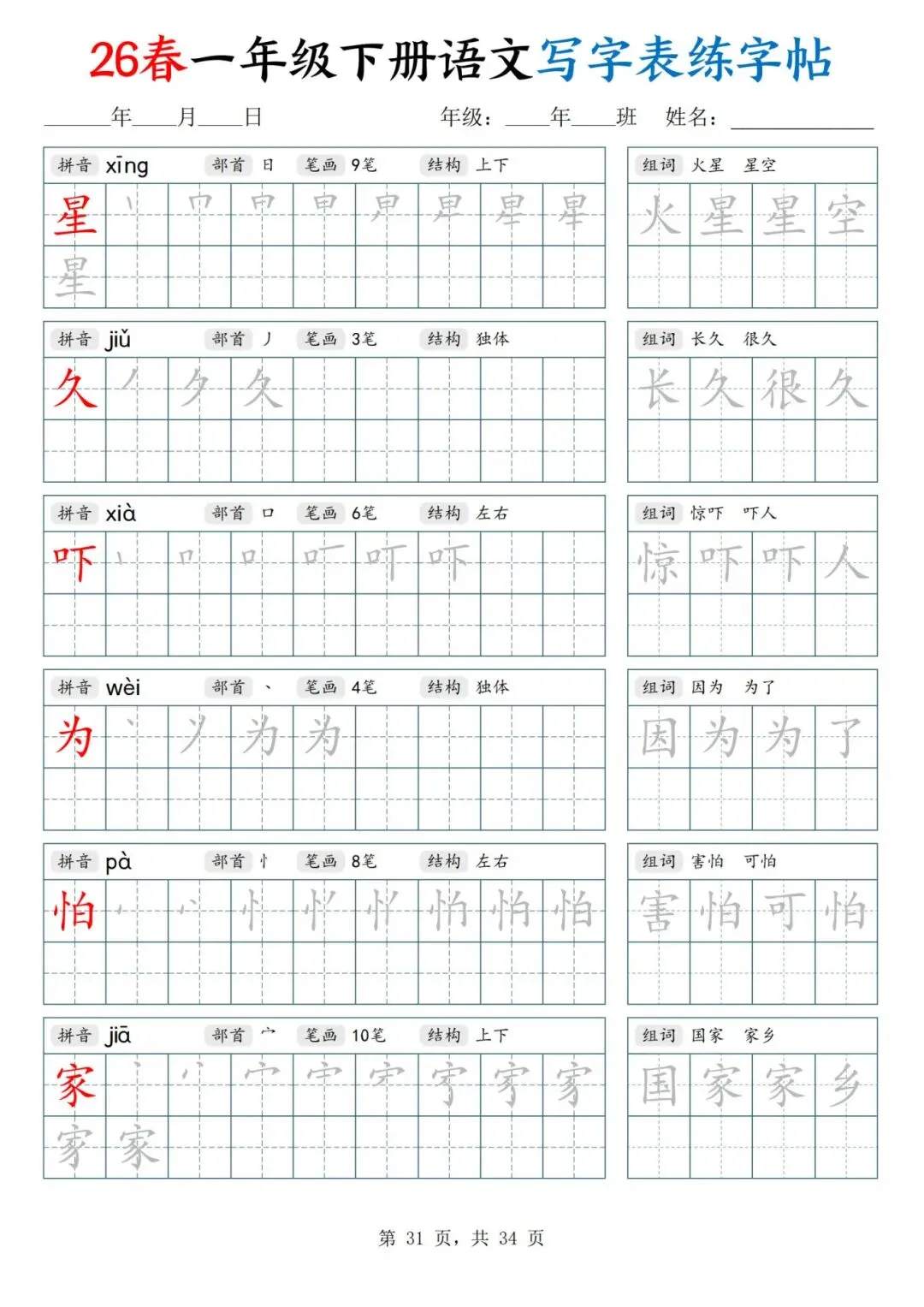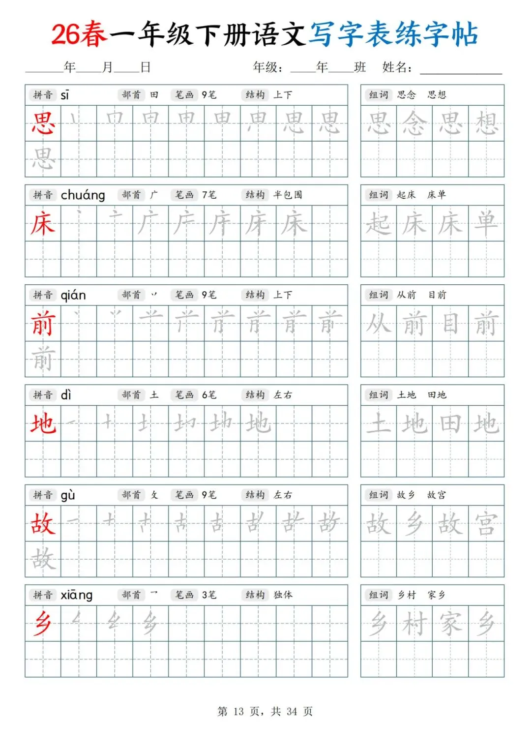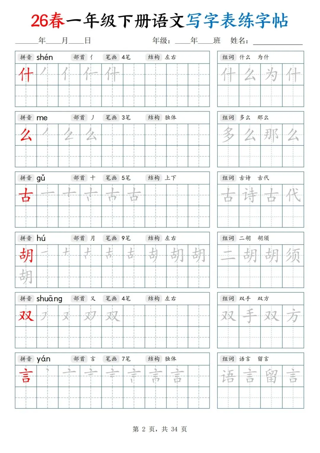 26春一年级下册人教部编版【语文写字表字帖】|完整电子版可打印