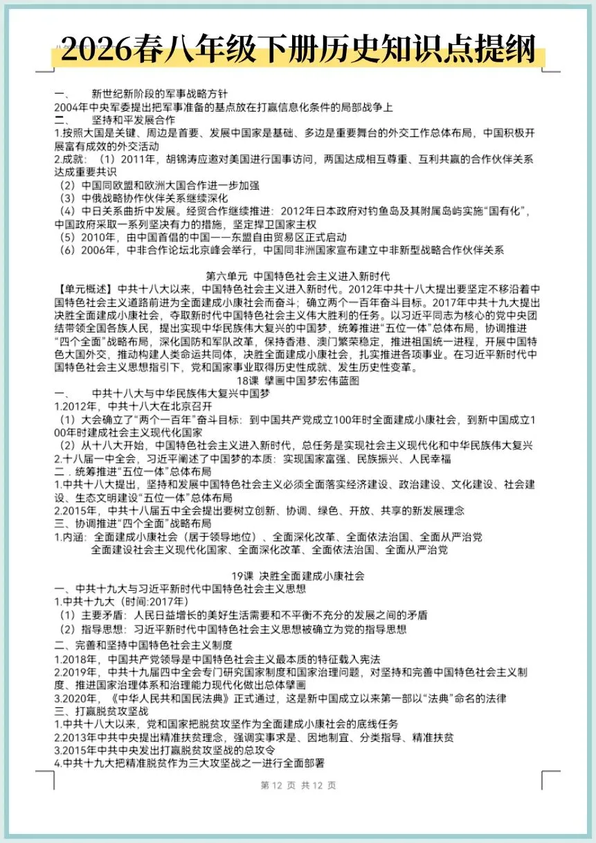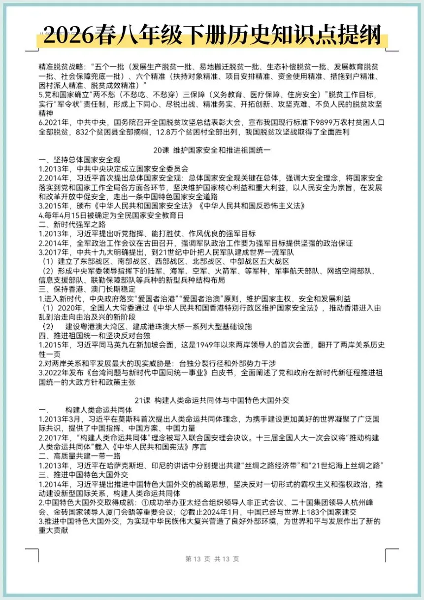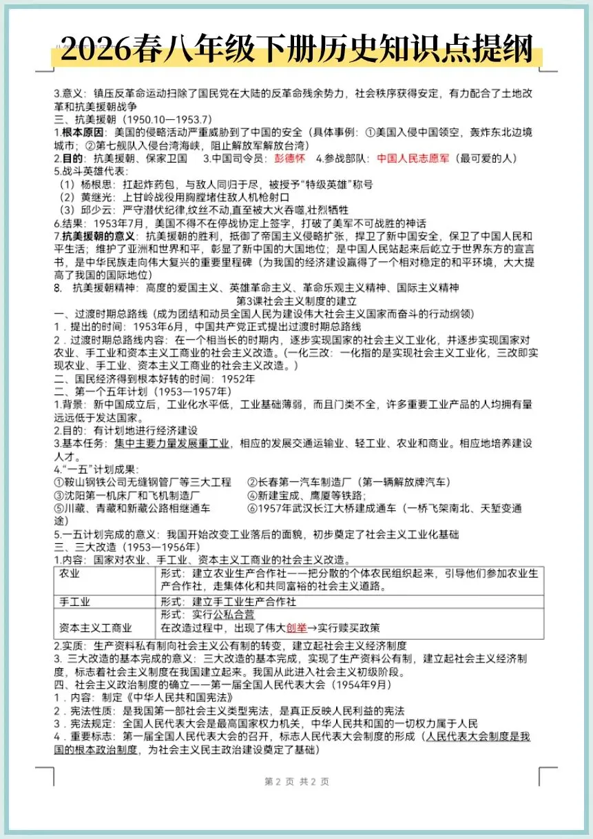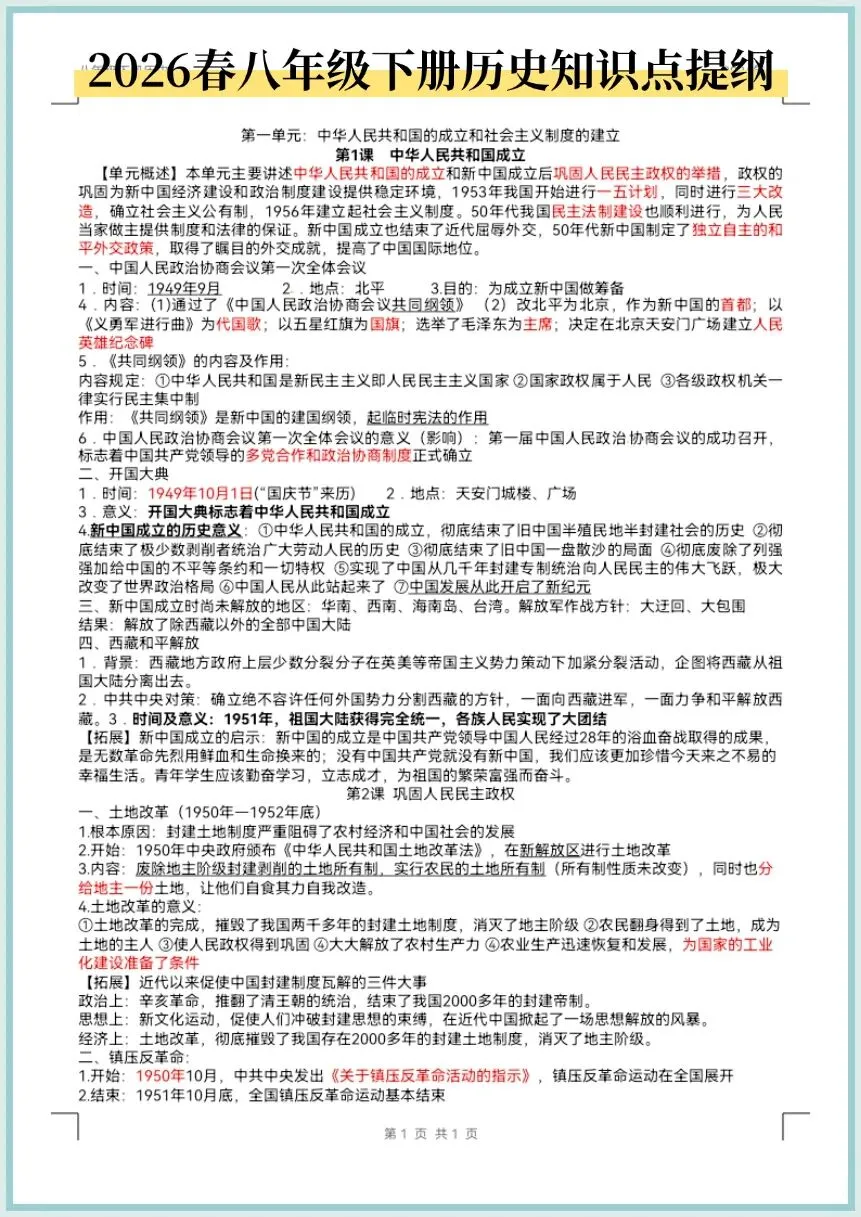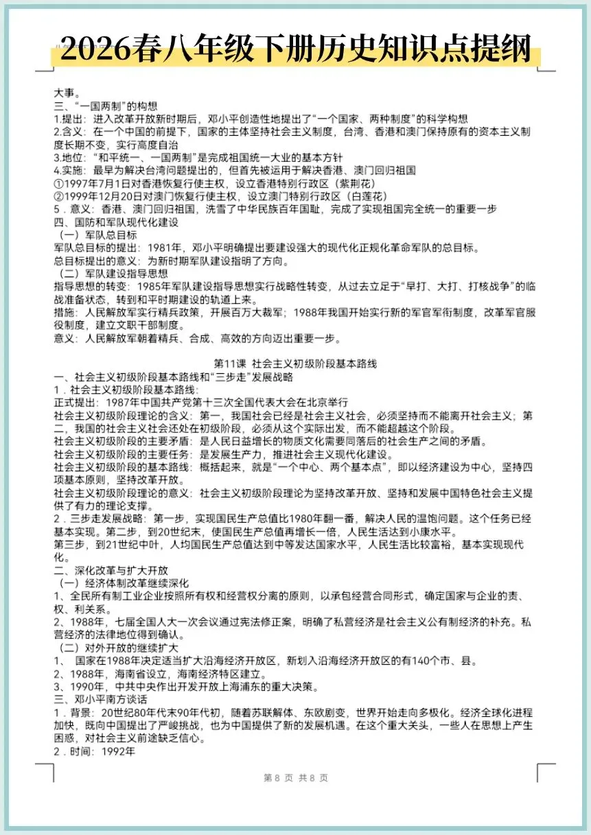 2026春八年级下册历史知识点提纲,电子版可打印!