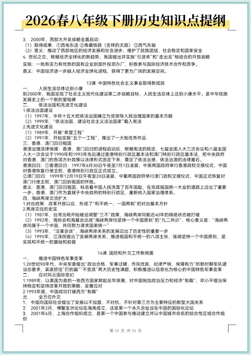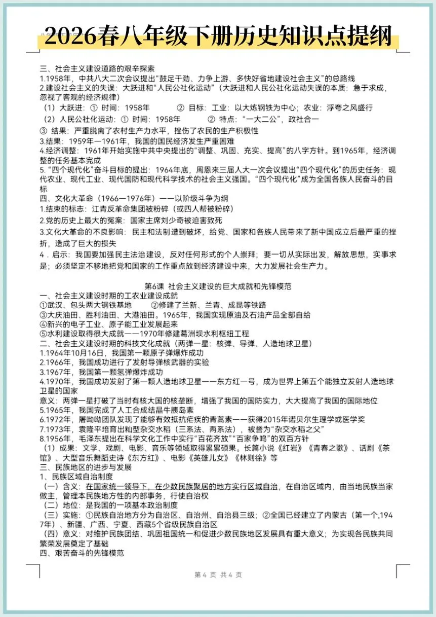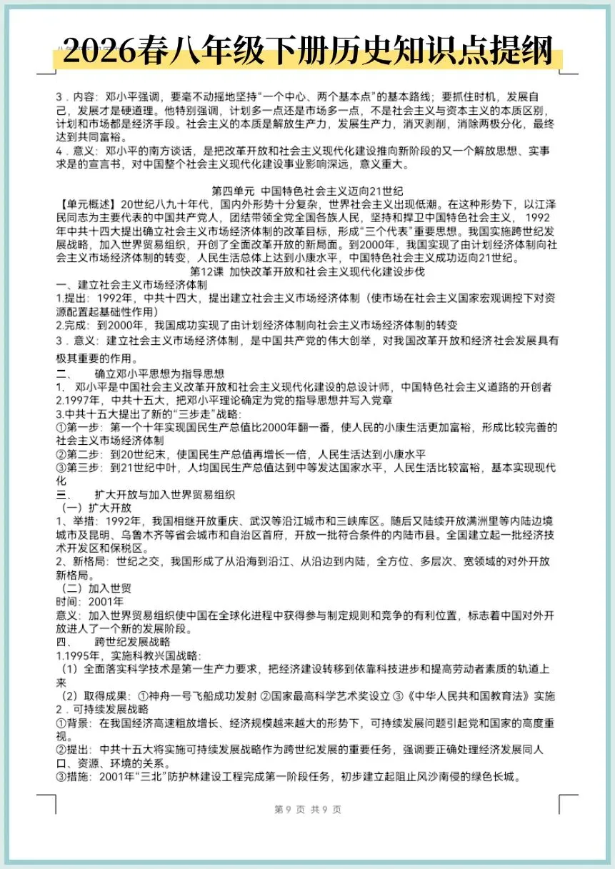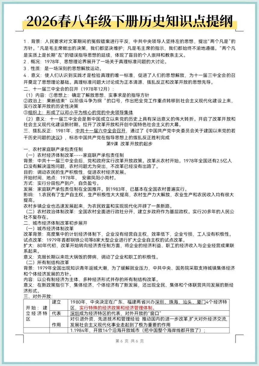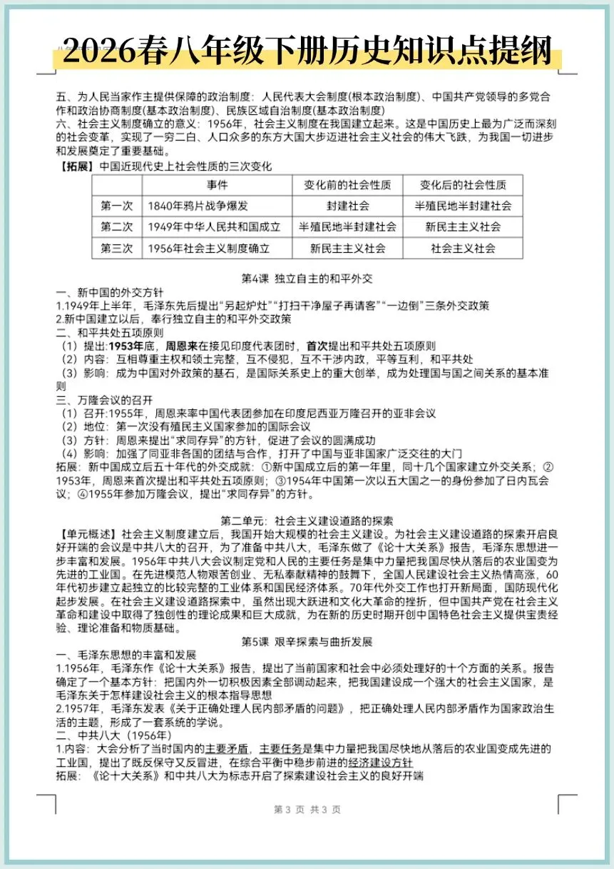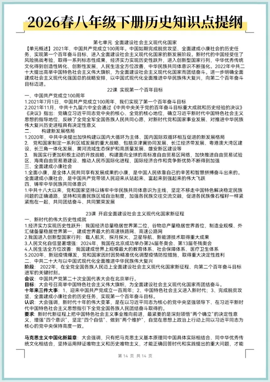 2026春八年级下册历史知识点提纲,电子版可打印!