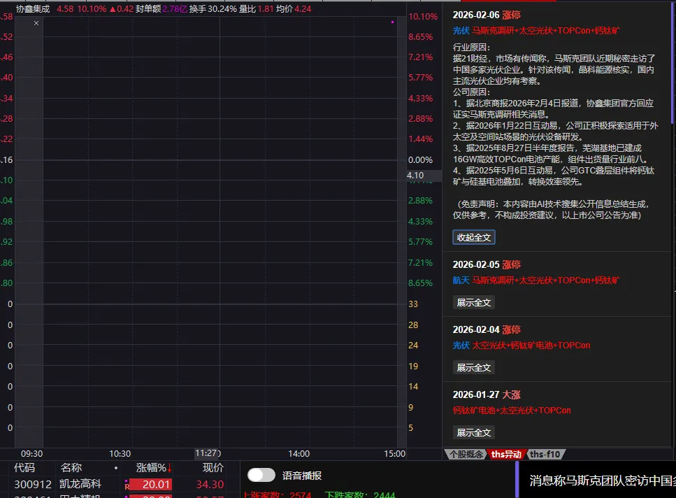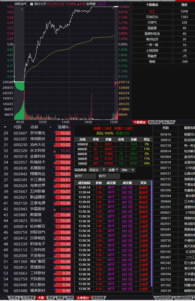 个股概念题材:显示个股概念题材和强度,如果概念板块属于当日最强前5标记红色。点击可联动显示板块成分股。
