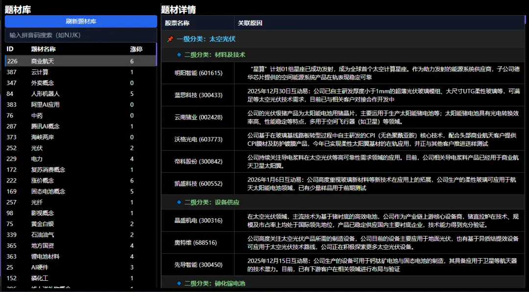 题材轮动:显示最近热门题材板块,涨停个股,在轮动行情下帮忙短线选手预判明日可能轮动到的方向。